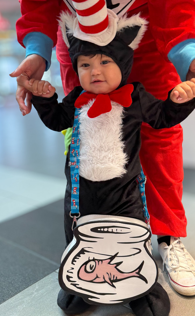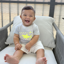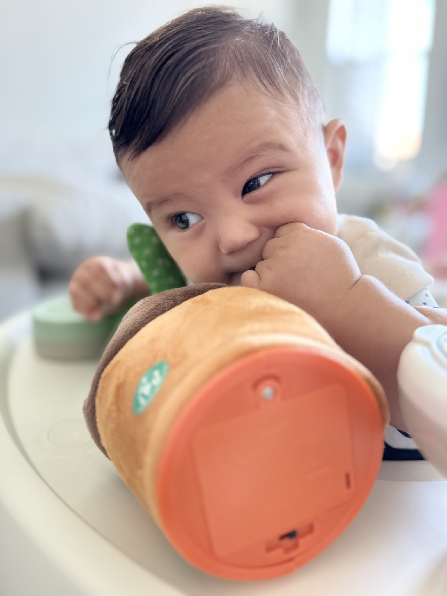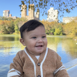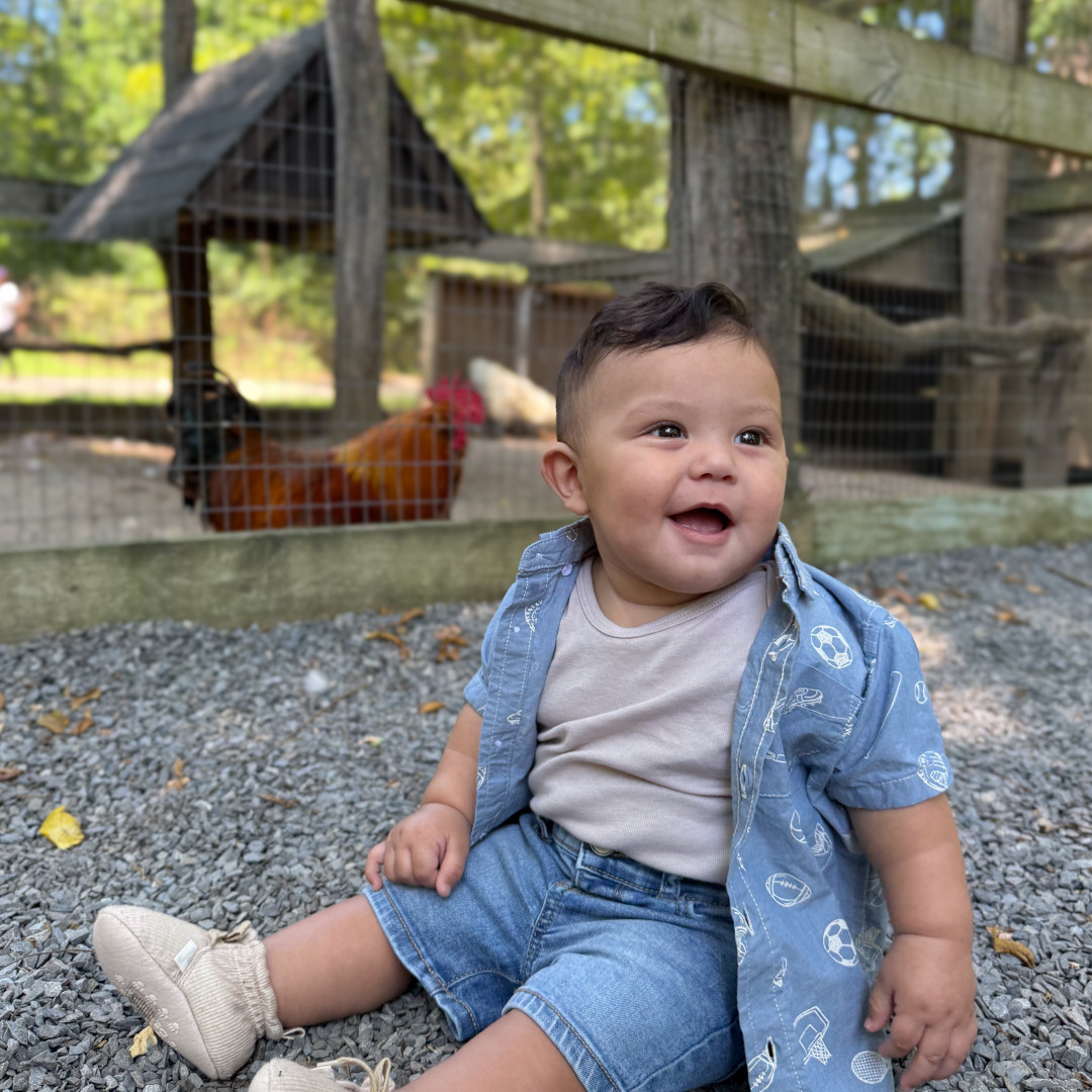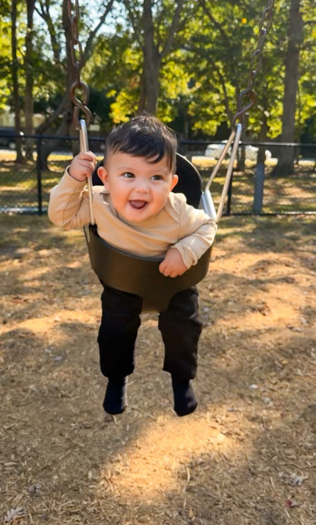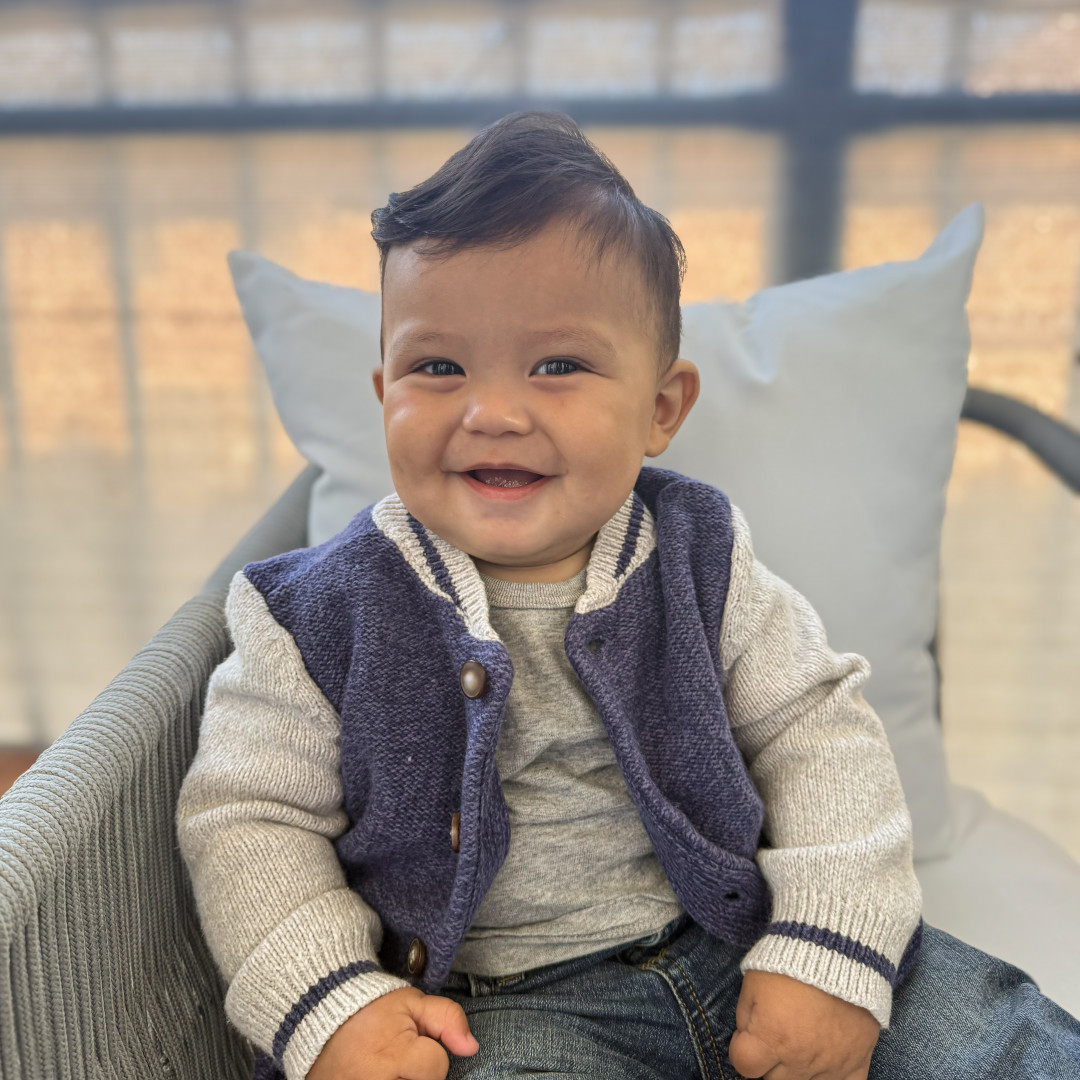 A tiny daredevil with two bottom teeth and zero fear—he stands up like a pro anytime he gets the chance and tries to turn his crib into an escape room! Everything within reach is doomed to become a chew toy because if it fits in his mouth, it’s fair game. Crawling and climbing are his new hobbies, and he’s already plotting world domination. His jam? “Wheels on the Bus,” “Old MacDonald,” and “La Vaca Loca.”