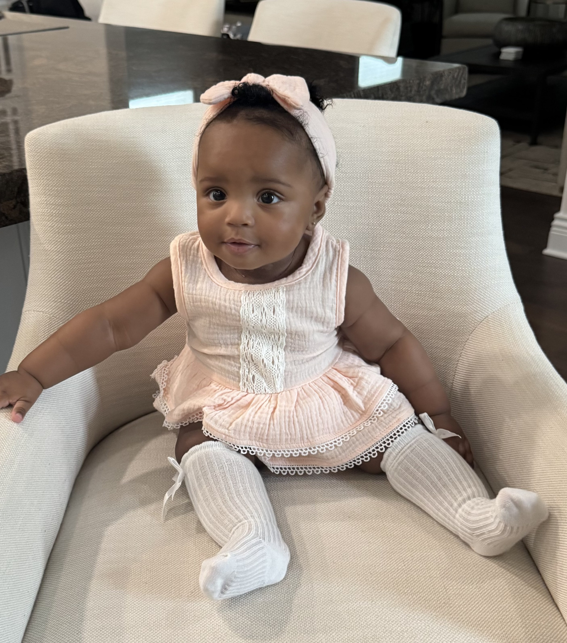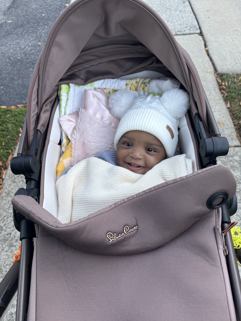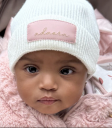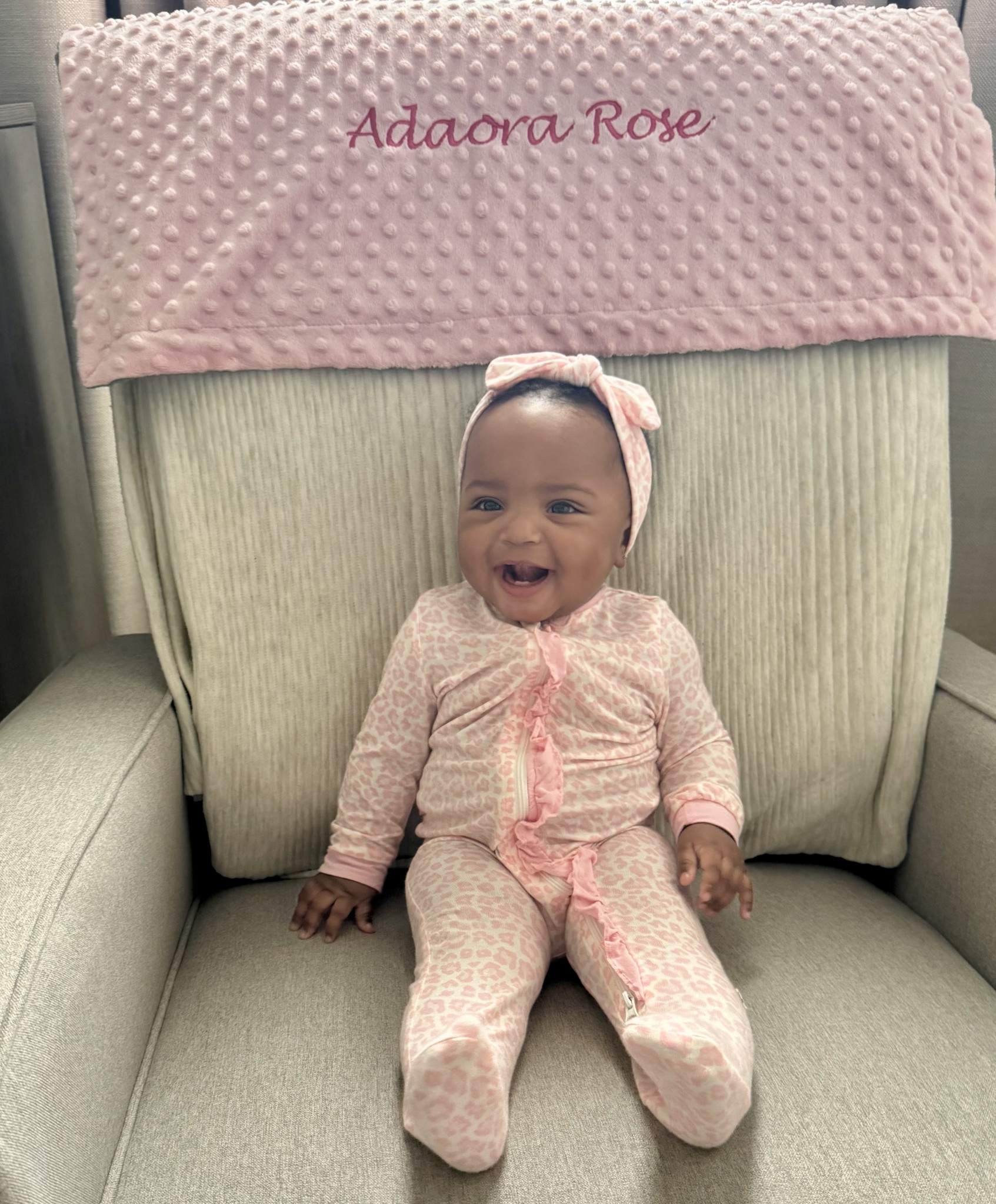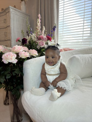 Everywhere she goes, people say how beautiful she is and how we picked the perfect name. Adaora means “the people’s daughter” in Igbo—and that’s exactly who she is. She has a twinkle in her eyes that’s undeniable, and even wakes up from naps giggling. She loves meeting new people, observes everything, and nothing misses Adaora! She dances to “Shake Your Booty,” gives the sweetest kisses, and charms all with her dimples, curly hair, and joyful spirit.