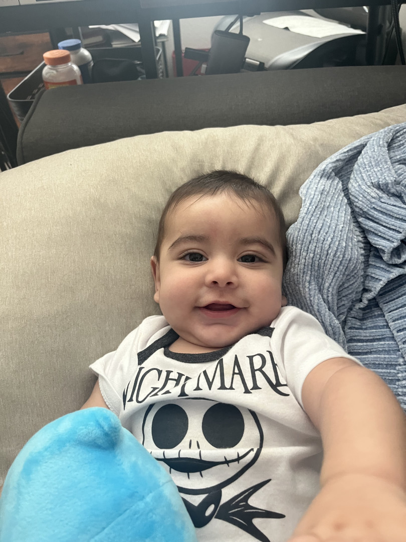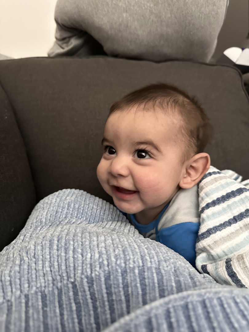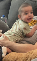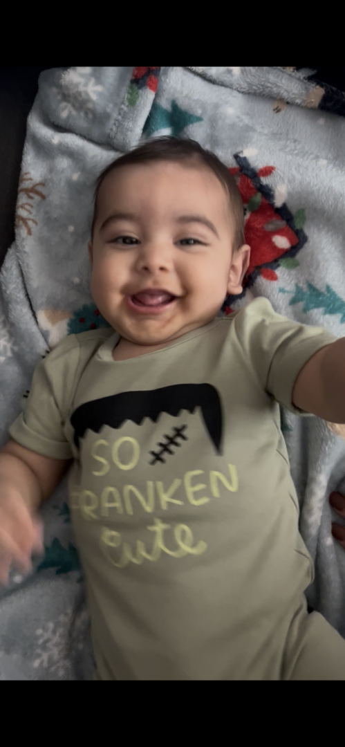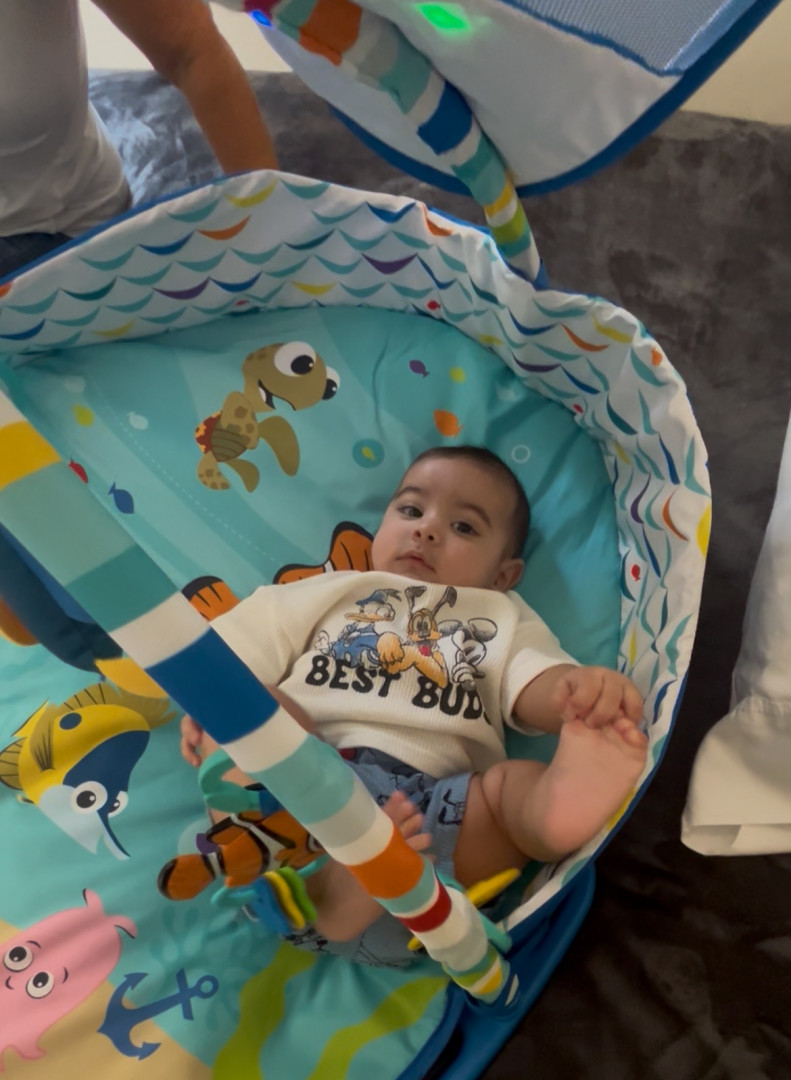 What are Amir's favorite activities?At 4 months, Amir loves tummy time and practicing his rolls, he kicks with so much energy you’d think he’s already training for sports! He’s fascinated by bright colors and little animal pictures, loves discovering his hands, and “talks” and laughs as if he’s part of every conversation. Curious and full of joy, he’s ready to explore the world.