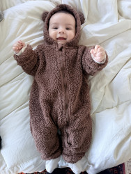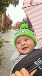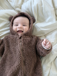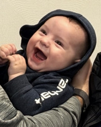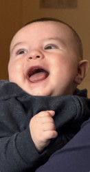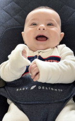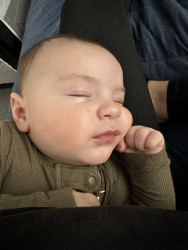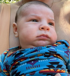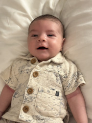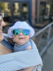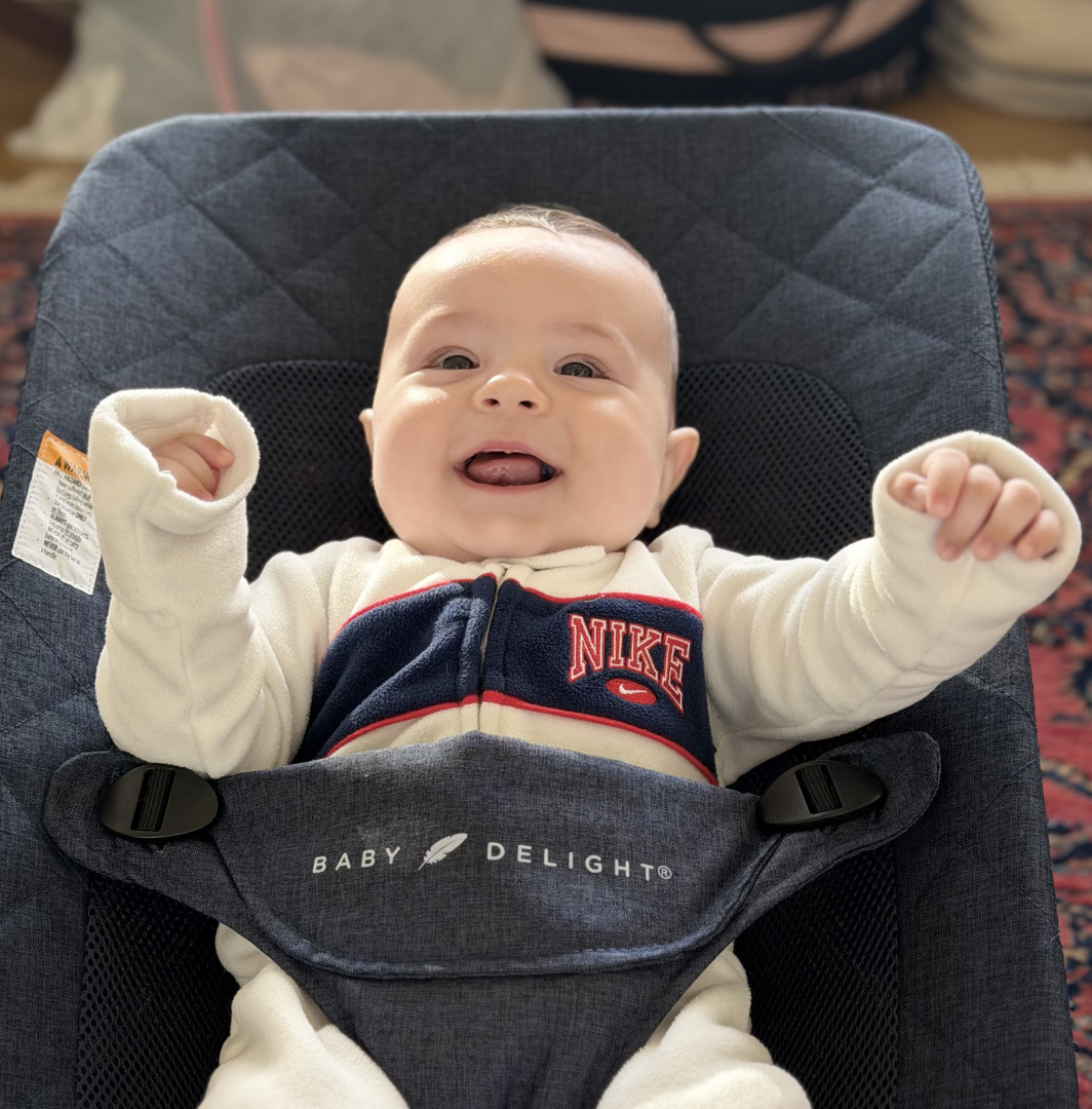 Asher is alert and curious! He loves fresh air and short walks in the carrier. He enjoys big morning stretches with a little toot and smile!