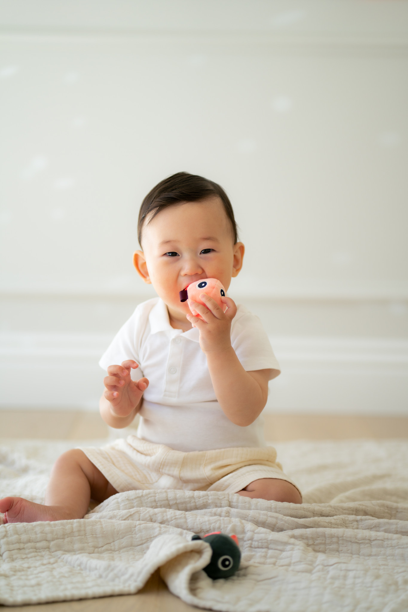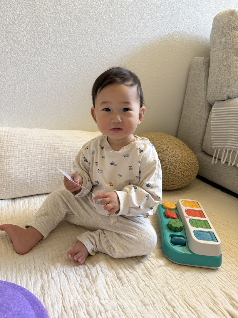 Our son is full of energy and curiosity! He loves clapping his hands and flashing his bright smile whenever he’s happy. "Uh oh!" is his current favorite phrase. He has a special love for tags or anything that sticks out—always reaching for them with excitement. Bath time is his favorite part of the day, and he can’t get enough of splashing and having fun.
