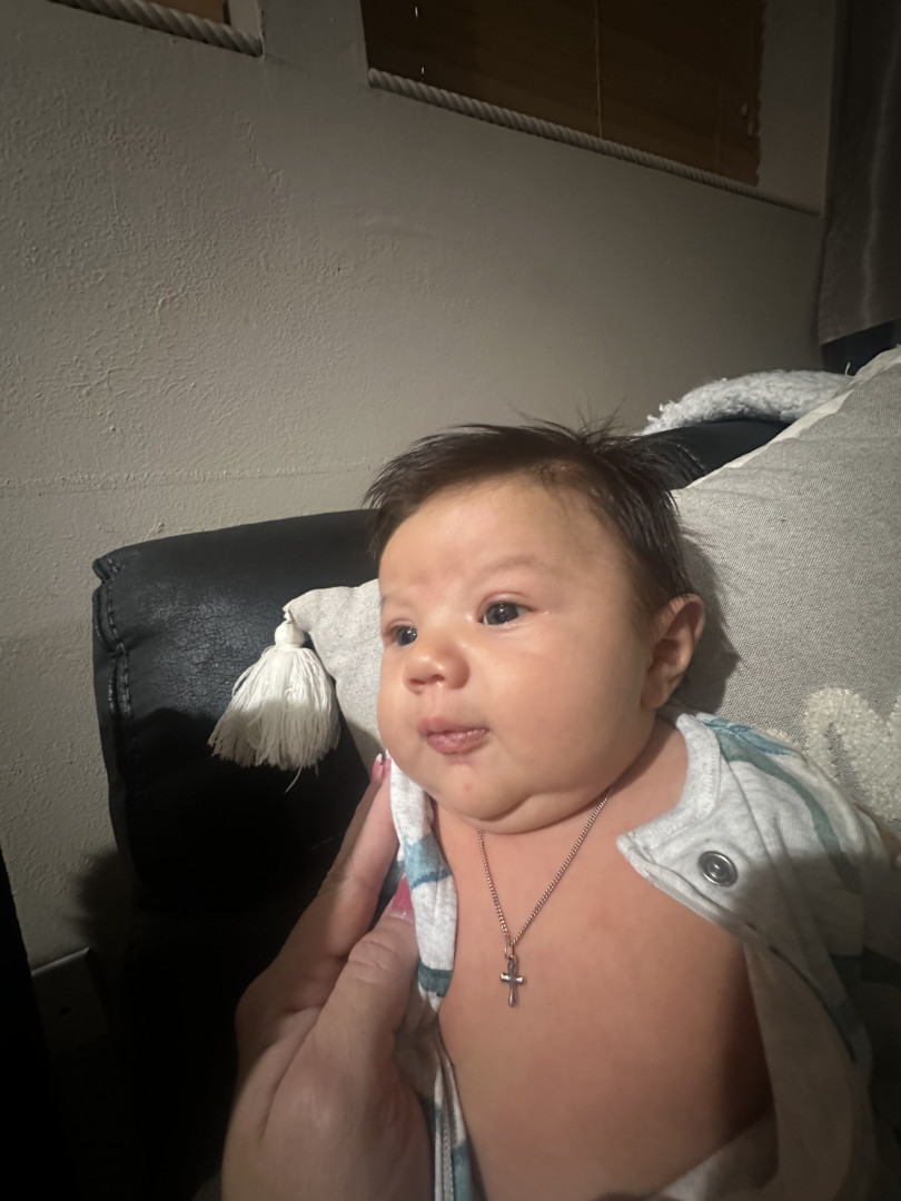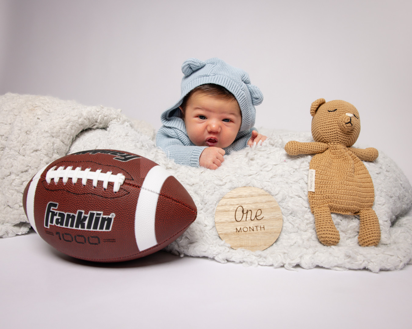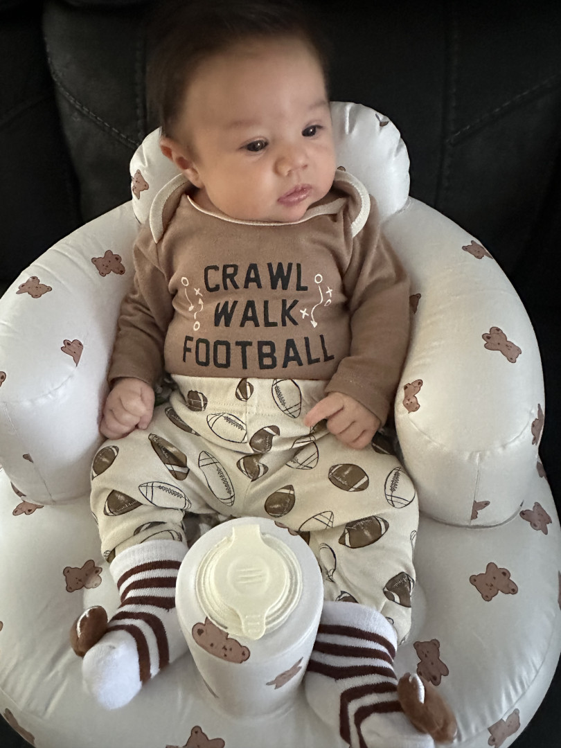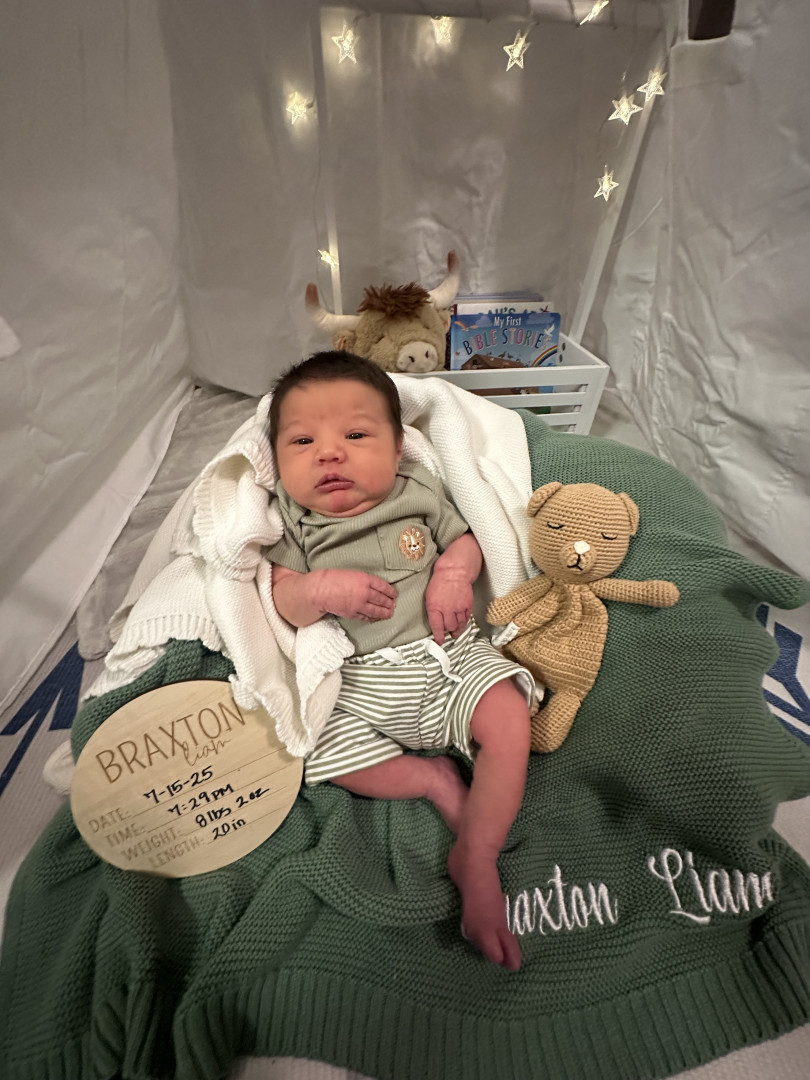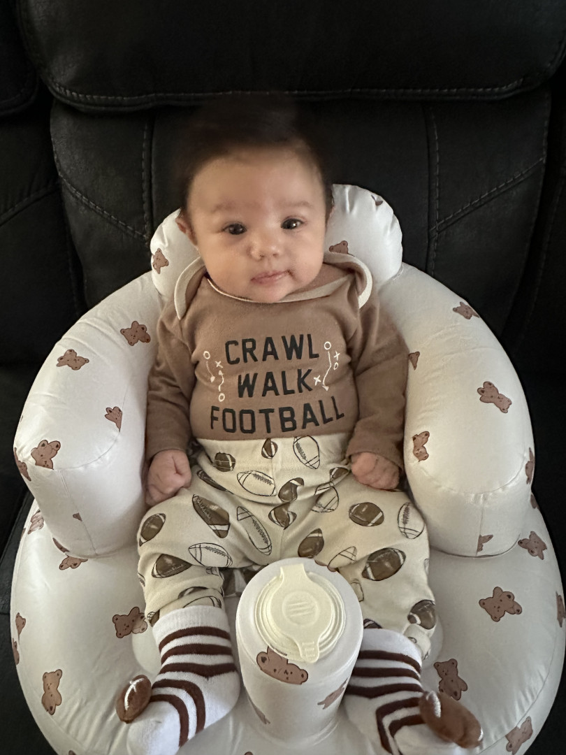 Braxton loves his swing, watching football with dad and is definitely a mamas boy. At just two months old, our baby is already beginning to shine with his own little personality. He’s incredibly expressive — his eyes light up with curiosity, and he’s starting to share his world with us through coos and tiny baby “conversations.”