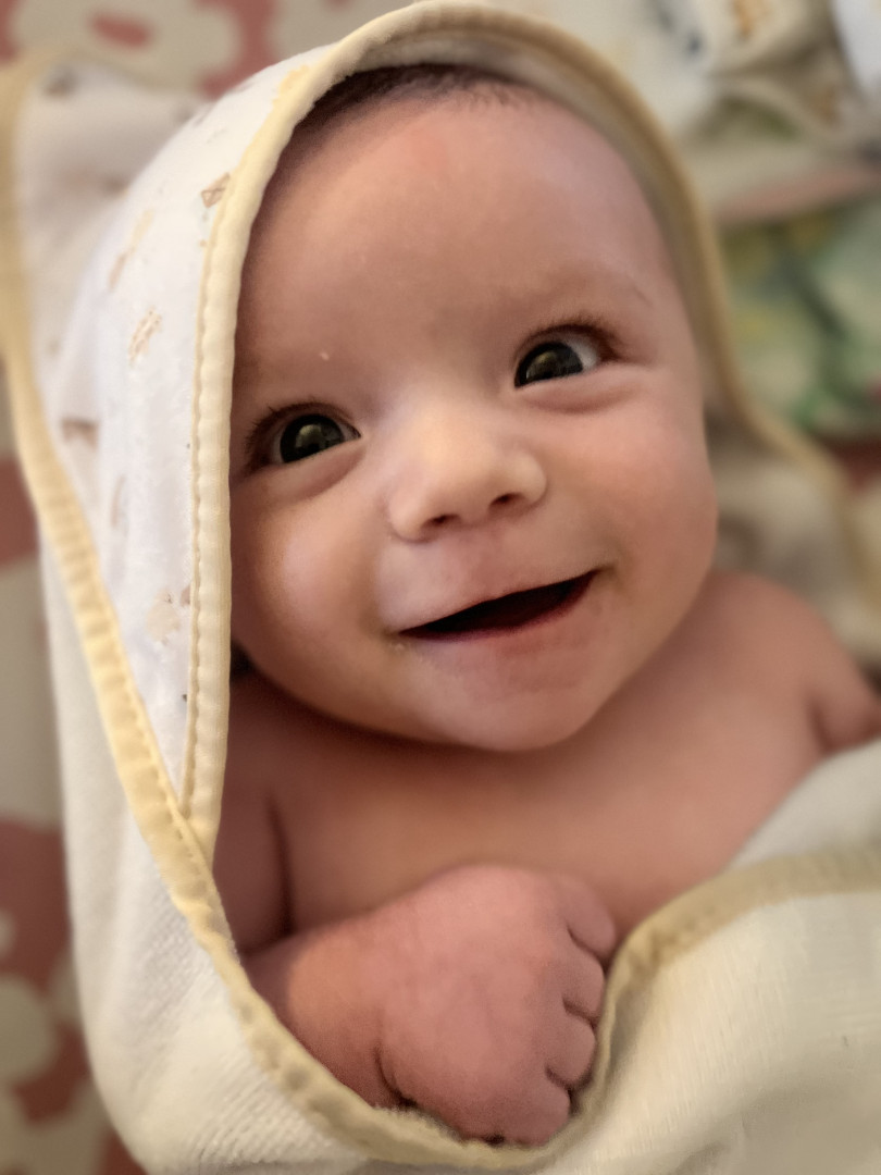 He is three months old, he is incredibly happy and growing so fast. He is calm and loves to watch his big sister play peek a boo with him. He is now starting to laugh and gives his big sister giggles when she tries to scare him!