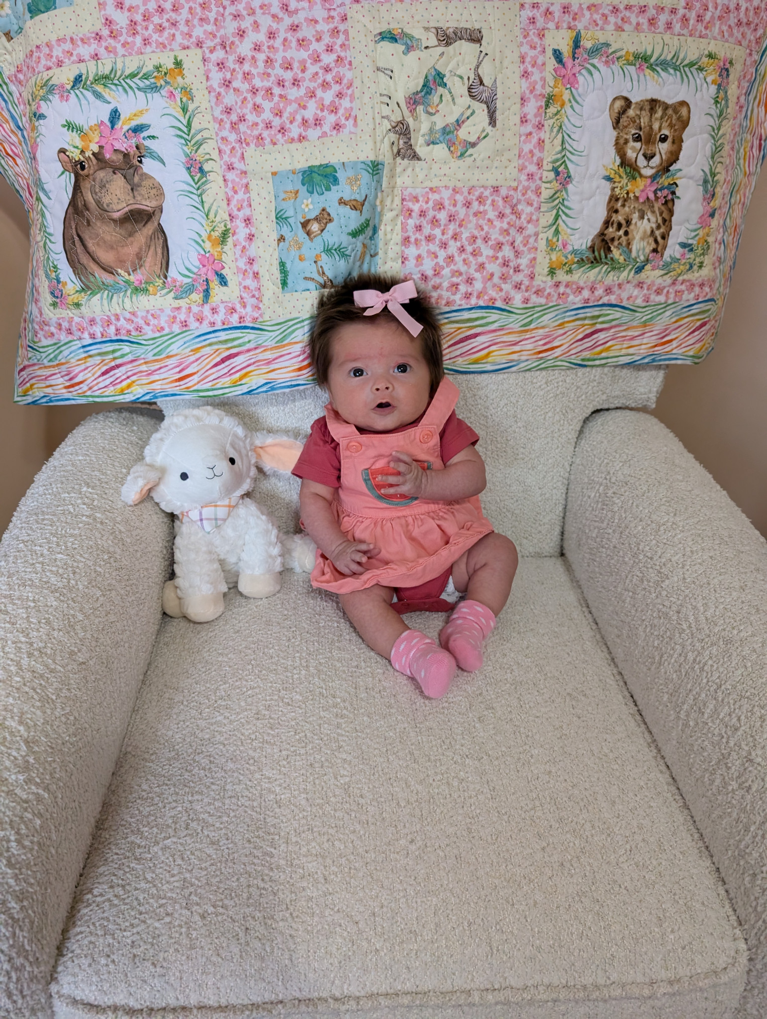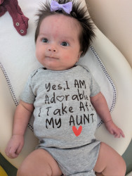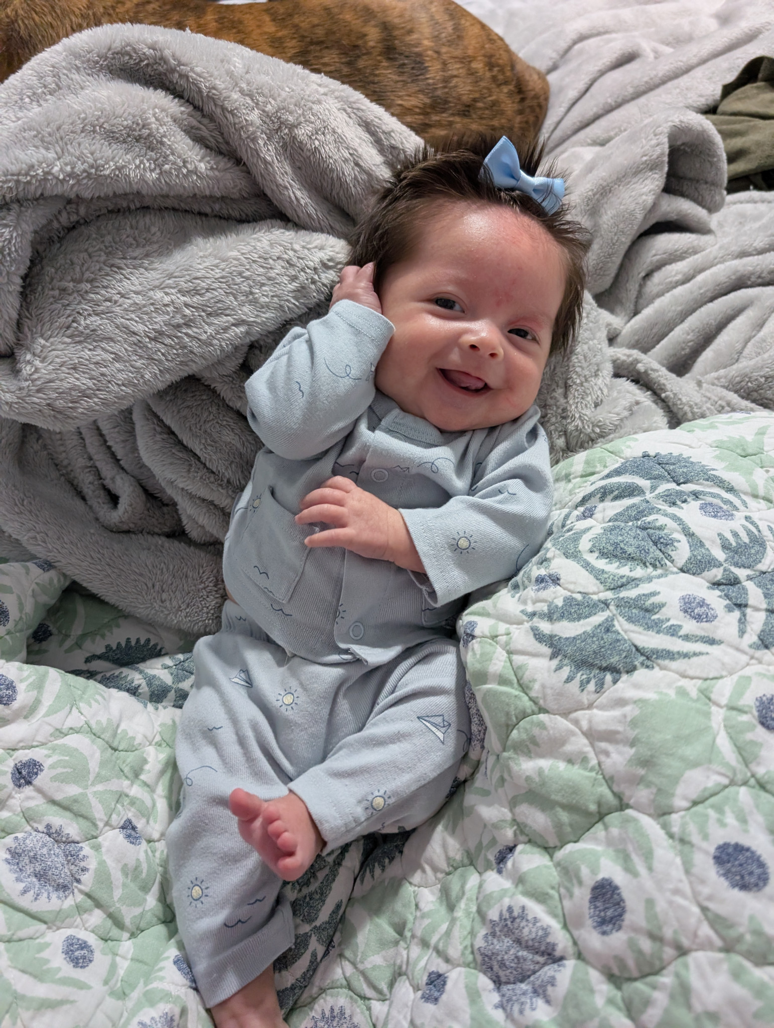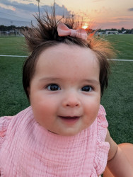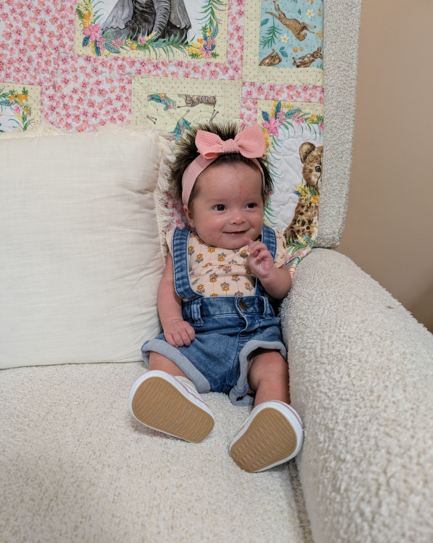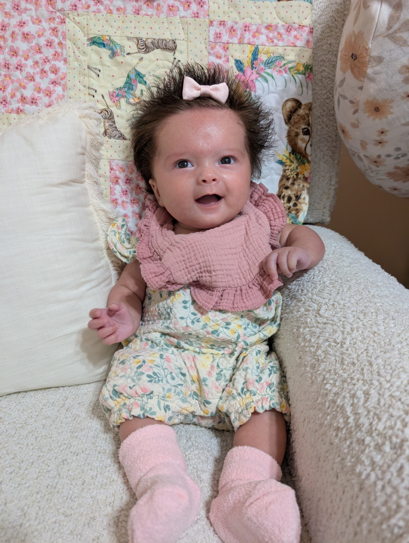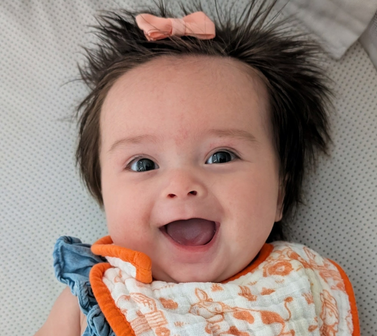 Claire may have arrived early but she’s been unstoppable since—now over 14 lbs and full of charm! She’s curious, expressive, and already flashing sweet smiles. We’re pretty sure she said “hi” the other day! With a full head of hair that looks like a baby wig, she rocks all the accessories. Nicknames include Claire Bear, Chipmunk, Chicken, “Claire with the Good Hair" & Claire Lizzie.