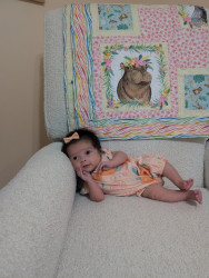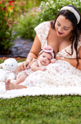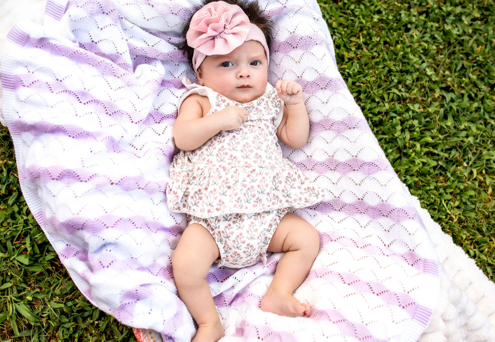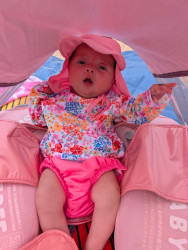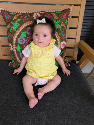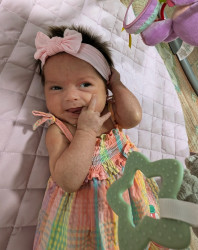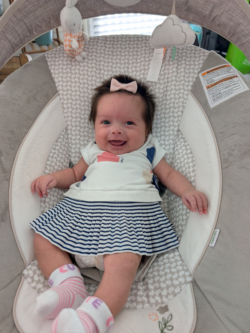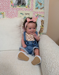 What are Claire's favorite activities?Claire loves waking up and telling us all about her amazing dreams. She's a sweet chatterbox. She could float in the sun or splash in the tub all day. Claire also enjoys exploring her activity mat. Whether she’s snuggling, smiling, or striking a pose, she brings joy to every moment—especially when she's sporting a fresh bow!