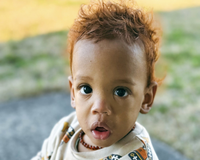 Look at him. He is loveable and get attention wherever he goes. Did I dye his hair? Of course not, it's natural. He has the cutest sand eyes