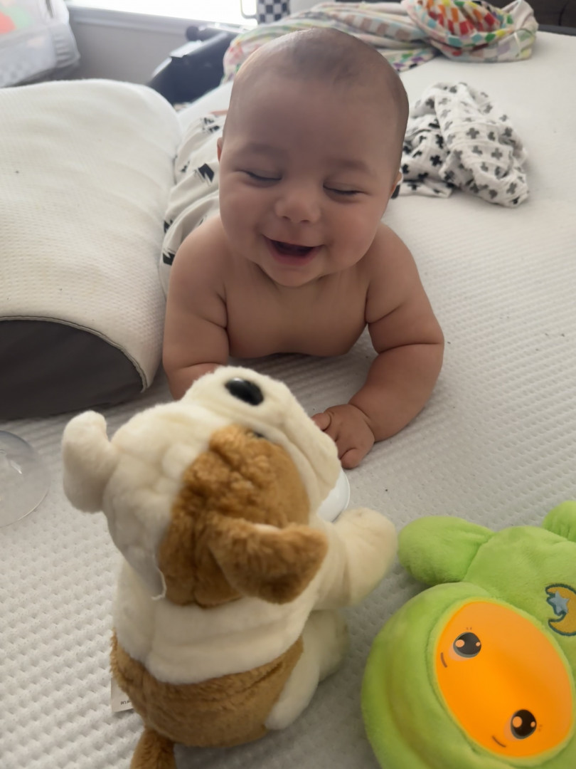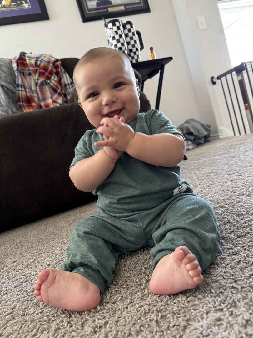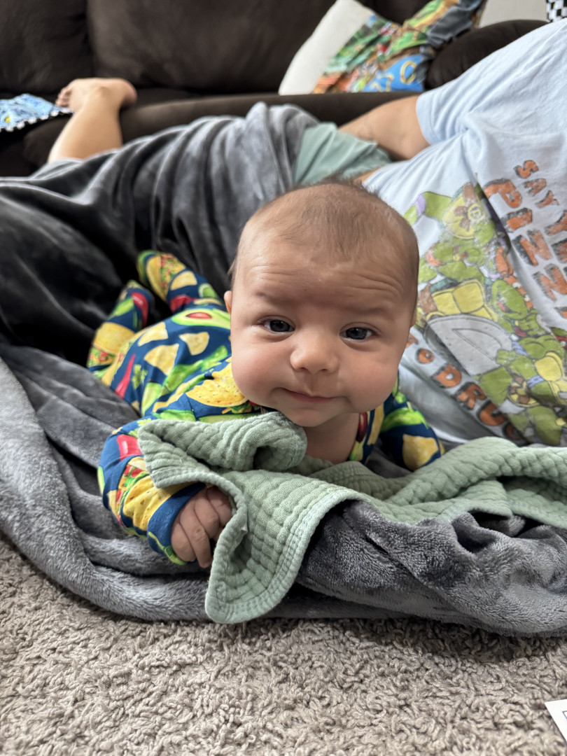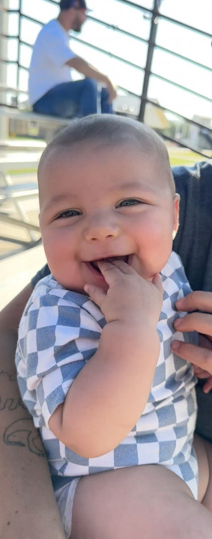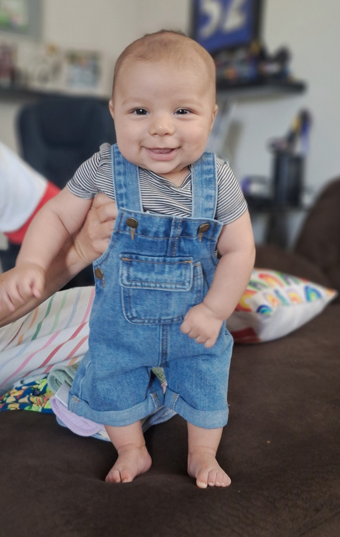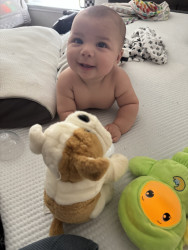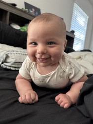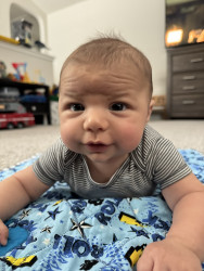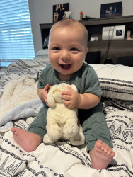 He’s our meatball! He likes to be silly, look at you with sparkles in his eyes and has a smile that will make you melt! He’s a master at tummy time and is ready to be on the move!! Our squish LOVES his big brother and is always watching his every move! Our bubs is a happy guy who gives as much love as he receives! He truly is our greatest gift!