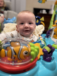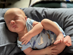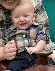 Declan is a sunshine-soaked snuggle machine, a happy baby with a serious attachment to hugs (think Velcro, but cuddlier). He’s the kind of baby who beams with his whole face, throws dramatic side-eyes when things aren’t up to his standards, and has a PhD in expressive eyebrows. When it comes to food, he’s not just hungry (he’s always hungry), he makes sure you know it. Loudly. Immediately. Repeatedly. Basically, he’s wonder in a diaper... with a side of snack-time urgency.