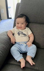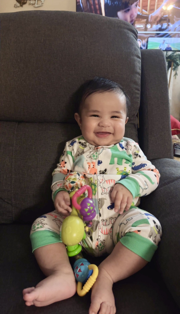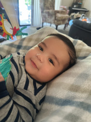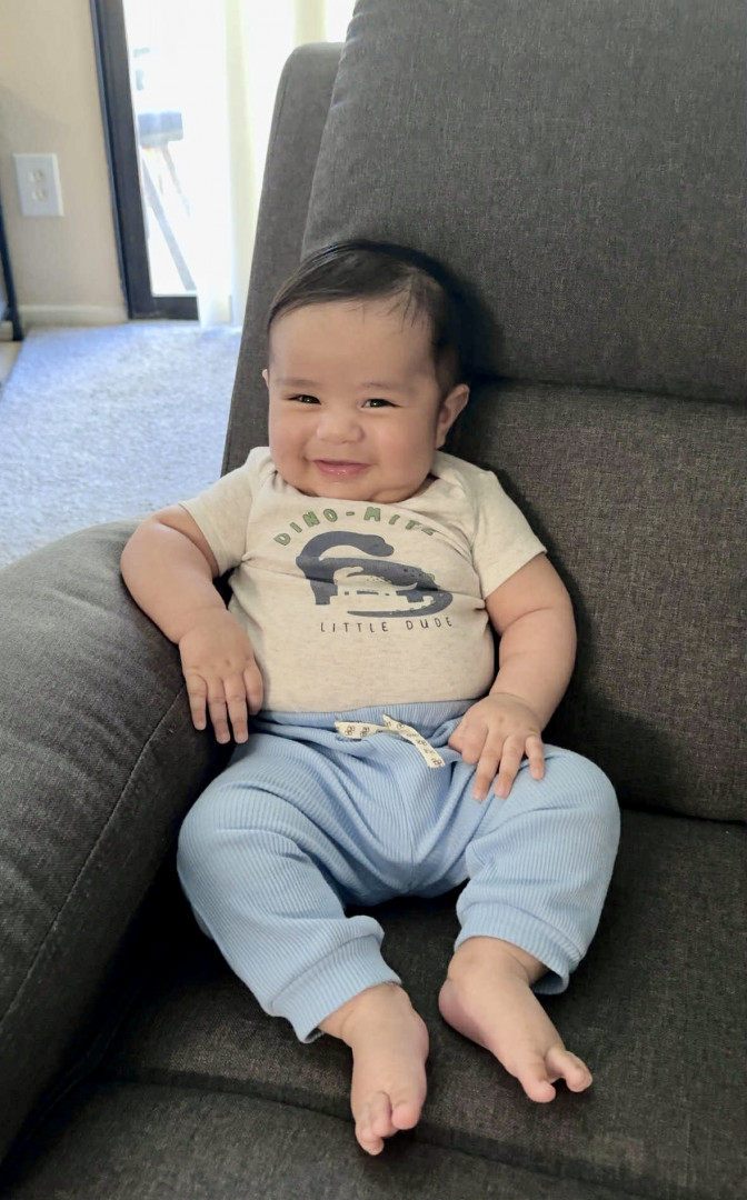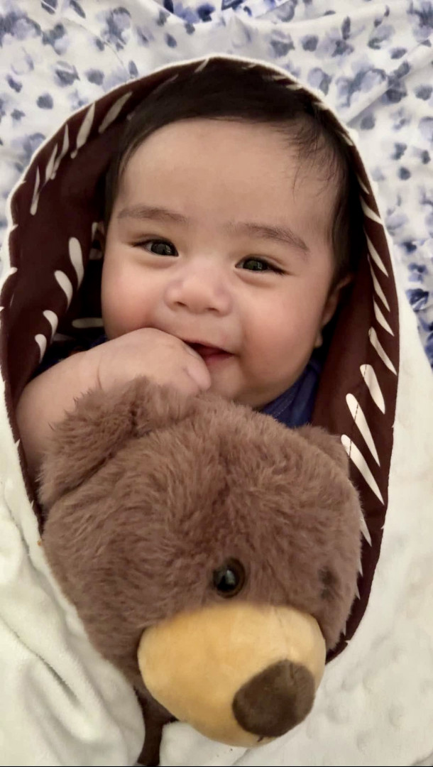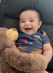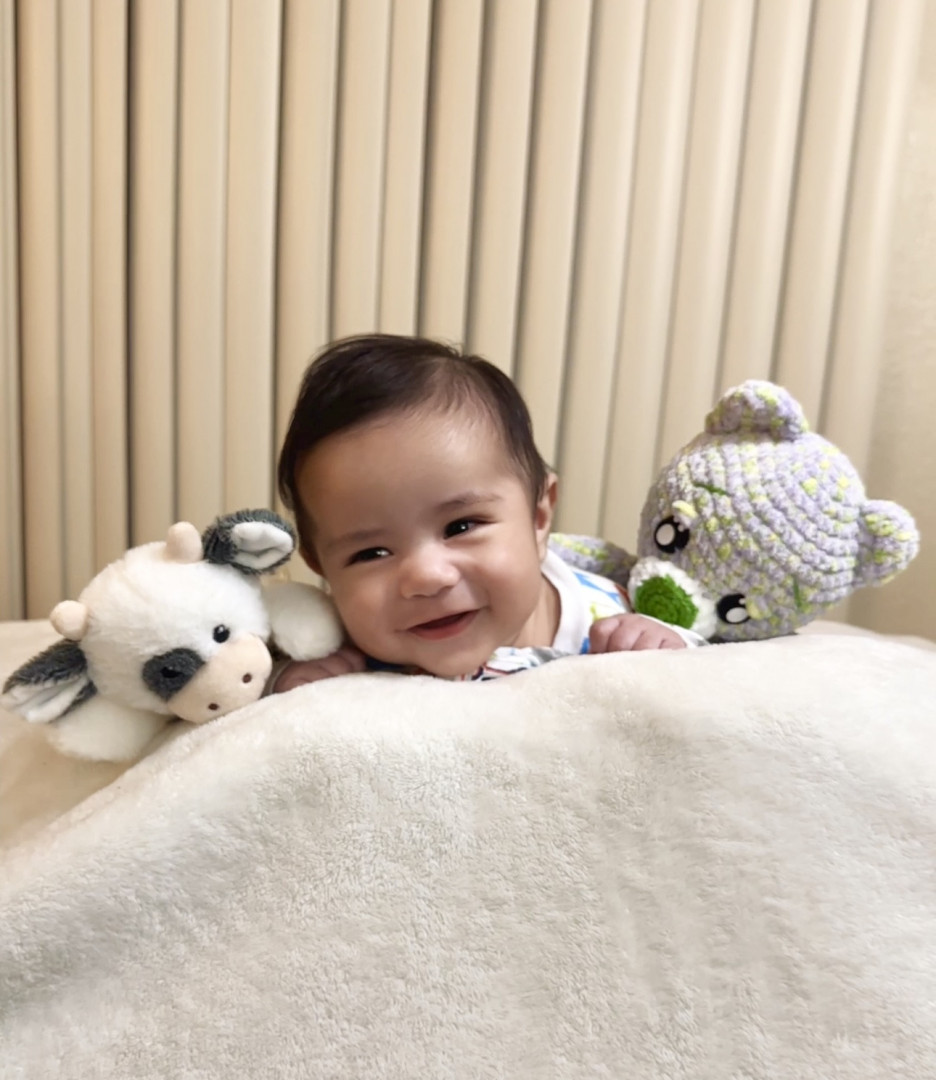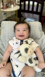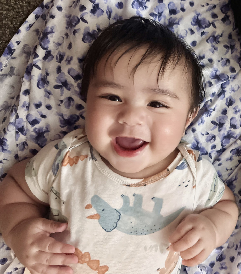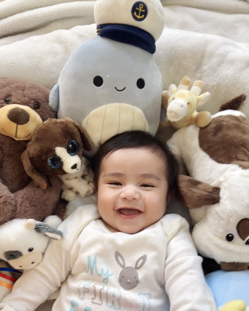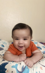 At 4 months old, he can socialize with the people through his babbling noises, giggles and laugh. He likes to be tickled and giggled like a puppy🥰