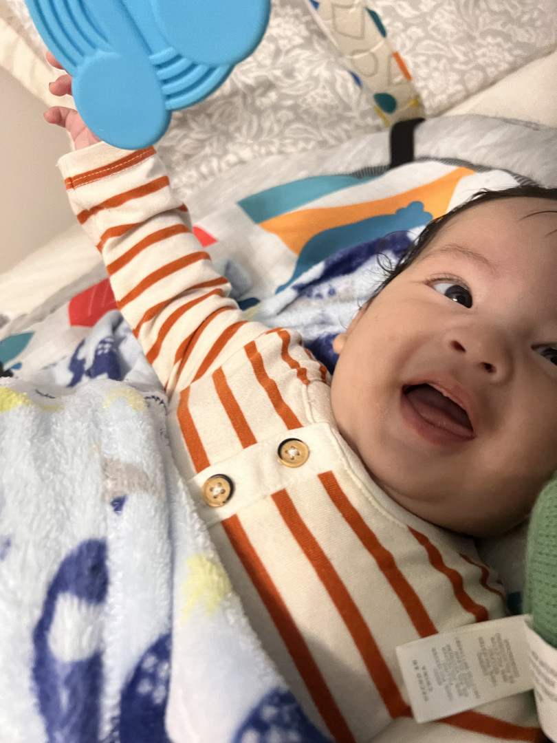 What are Ezequiel's favorite activities?Ezequiel is a very happy baby who loves to explore the world around him when he is not eating or sleepin. He loves to cuddle with mom and playing with dad. He’s recently started to discover his voice , he loves to talk and yell. Grabbing things is also a fun new activity he enjoys as well as turning to the side he’s not yet turning all the way but he’s working hard to do so. Exploring new textures and soon new foods one of his favorite things to pay with is a water bottle or his little elephant