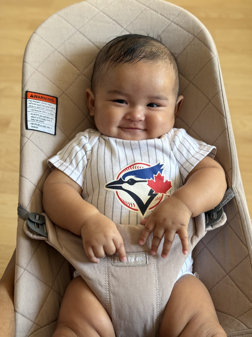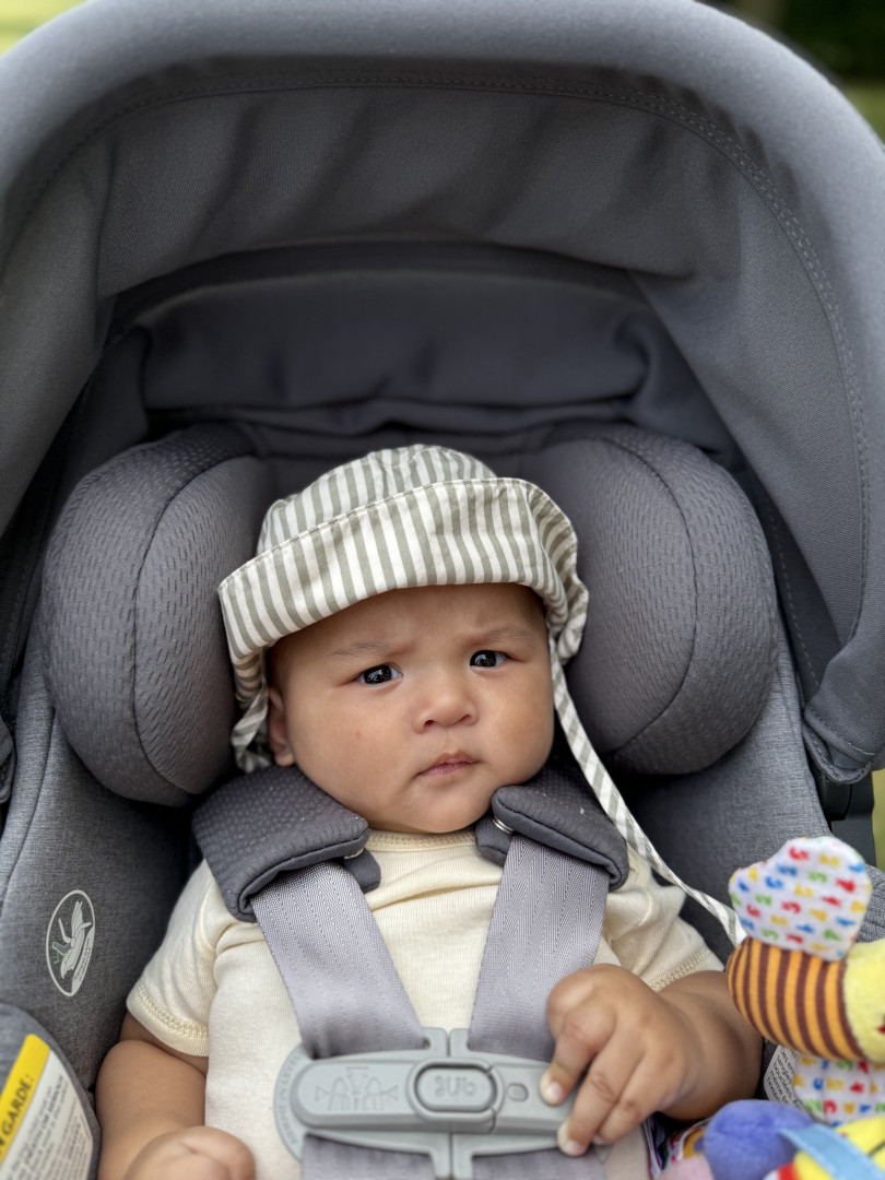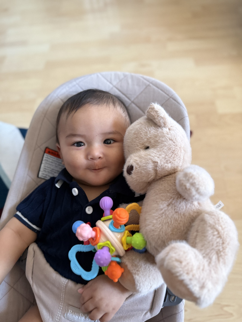 What are GAVRIEL SOLAIRE's favorite activities?Gavriel Solaire is the cutest little explorer! He loves being outside, wide-eyed and curious, soaking up every little detail. He babbles and giggles like he’s telling the best stories. In his crib, he kicks his piano with so much excitement and plays with his hanging toys like they’re his best friends. He’s just as happy during quiet time—lounging in his bouncer or lying on his mat, watching the trees above like it’s his favorite movie.