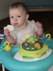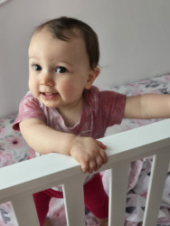 What are Hazel's favorite activities?She loves to crawl around, she has started to hold on to couches and coffee tables to walk now ( but she hasnt let go yet), she loves playing with her big brothers and she loves her food!