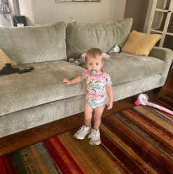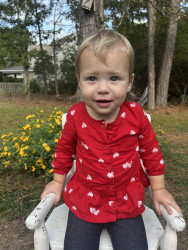 She is very intelligent and loves learning new words. She is extremely loving and likes to give hugs and kisses to mom, dad, and lots of people. She’s a big explorer and likes her independent time to find new things. She loves her big brother, our dog, Barley, and she thinks dogs are so much fun. She’s so loving and thoughtful for a 22 month old. She’s also very observant and shows us things she learns on her own every day. Her favorite words are Mommy, Daddy, Barley, and stinky.