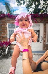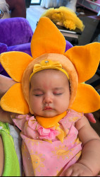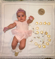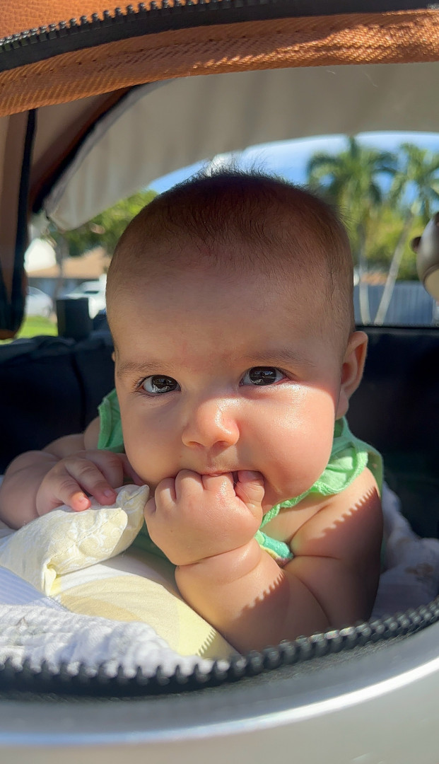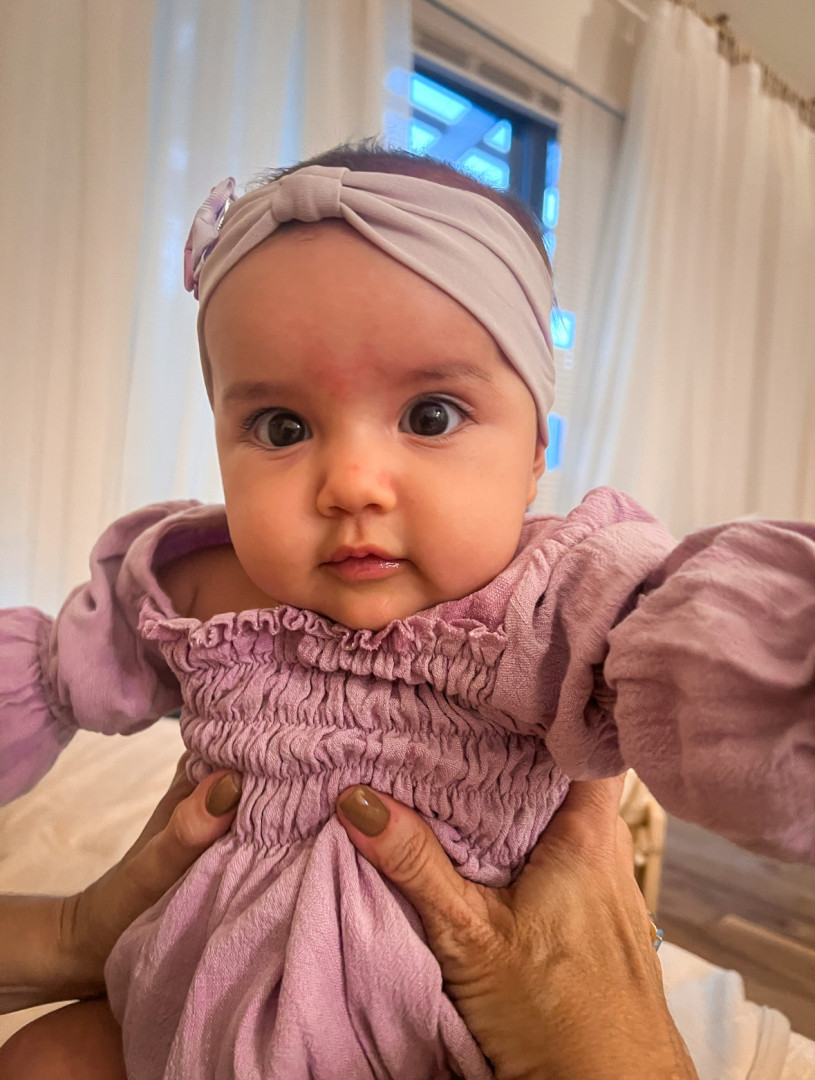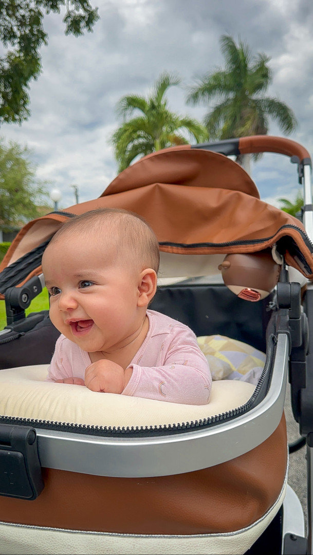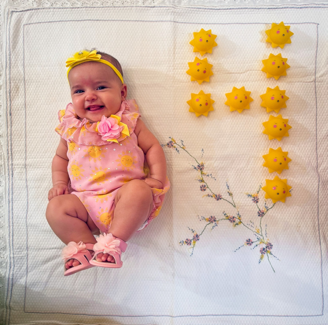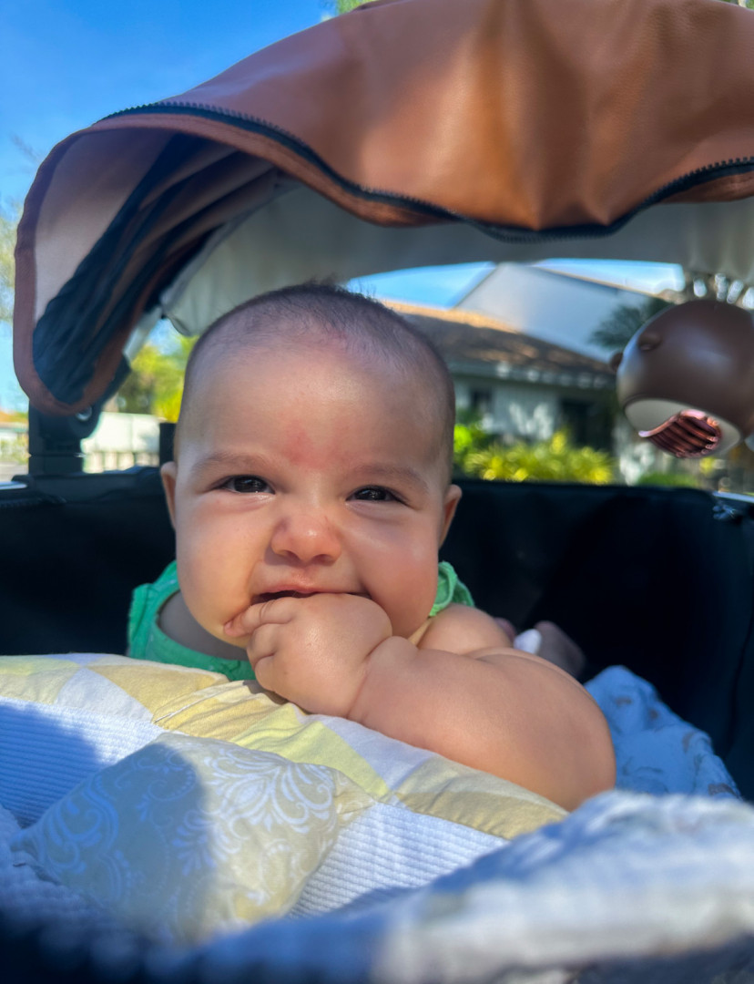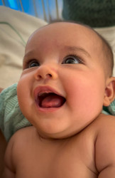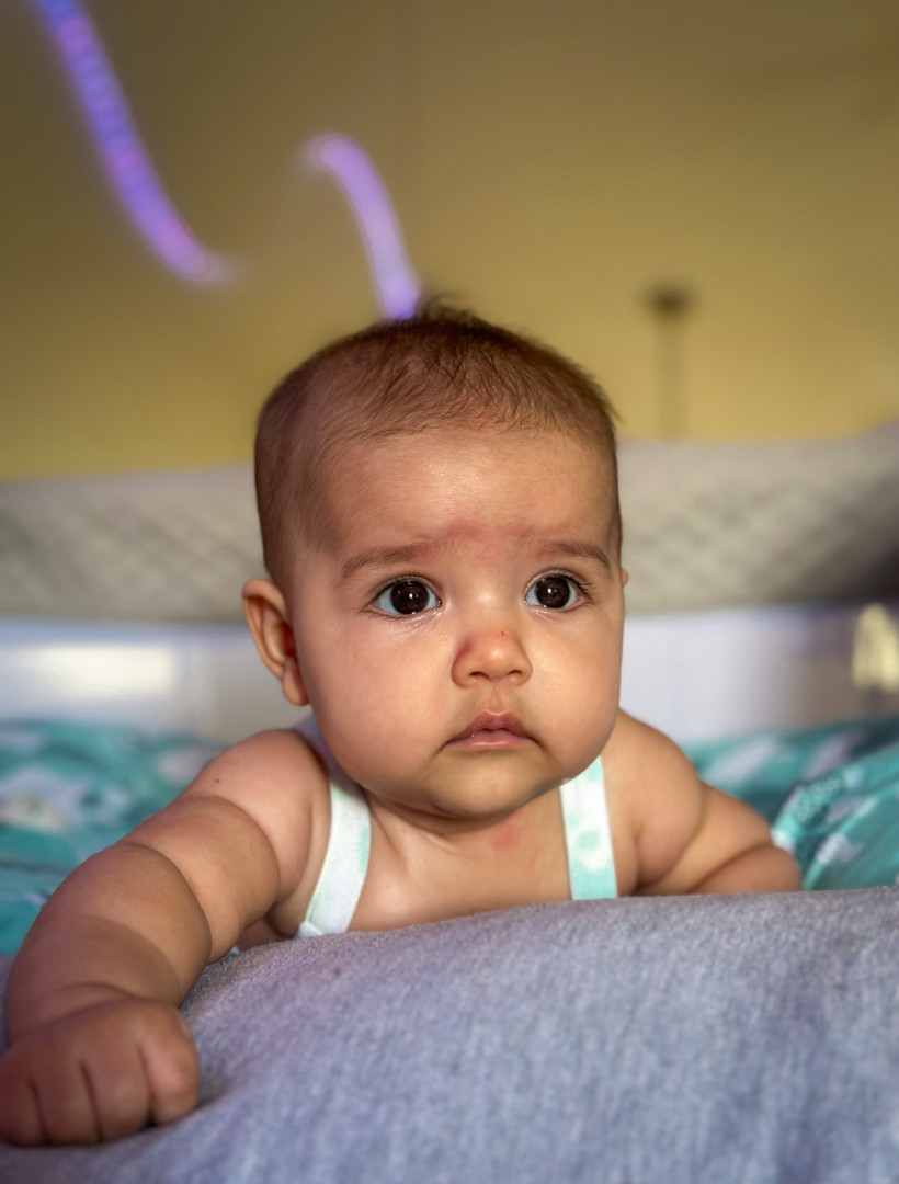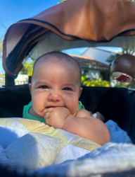 What are Helena's favorite activities?Helena loves greeting ceiling ventilators and even the trees that remind her of them. She rides in her stroller on her tummy, curious about every sight. Music makes her shine, especially when she coos and wiggles to Lilo and Stitch. She babbles as if she’s trying to join the conversation, giggles at herself in the mirror, cuddles her furry sisters Nala and Cloe, adores bath time and baby foot massages, and loves watching mom and dad cook since they are chefs.