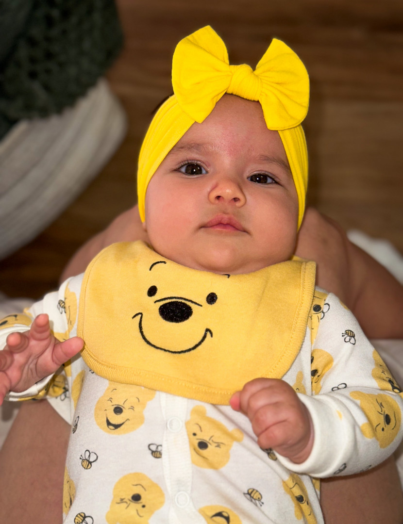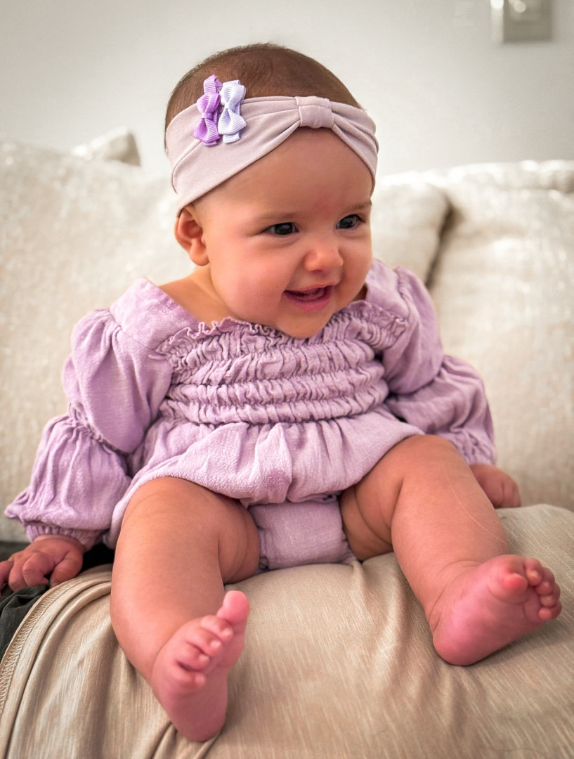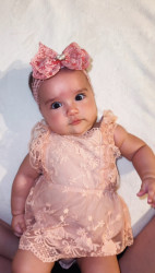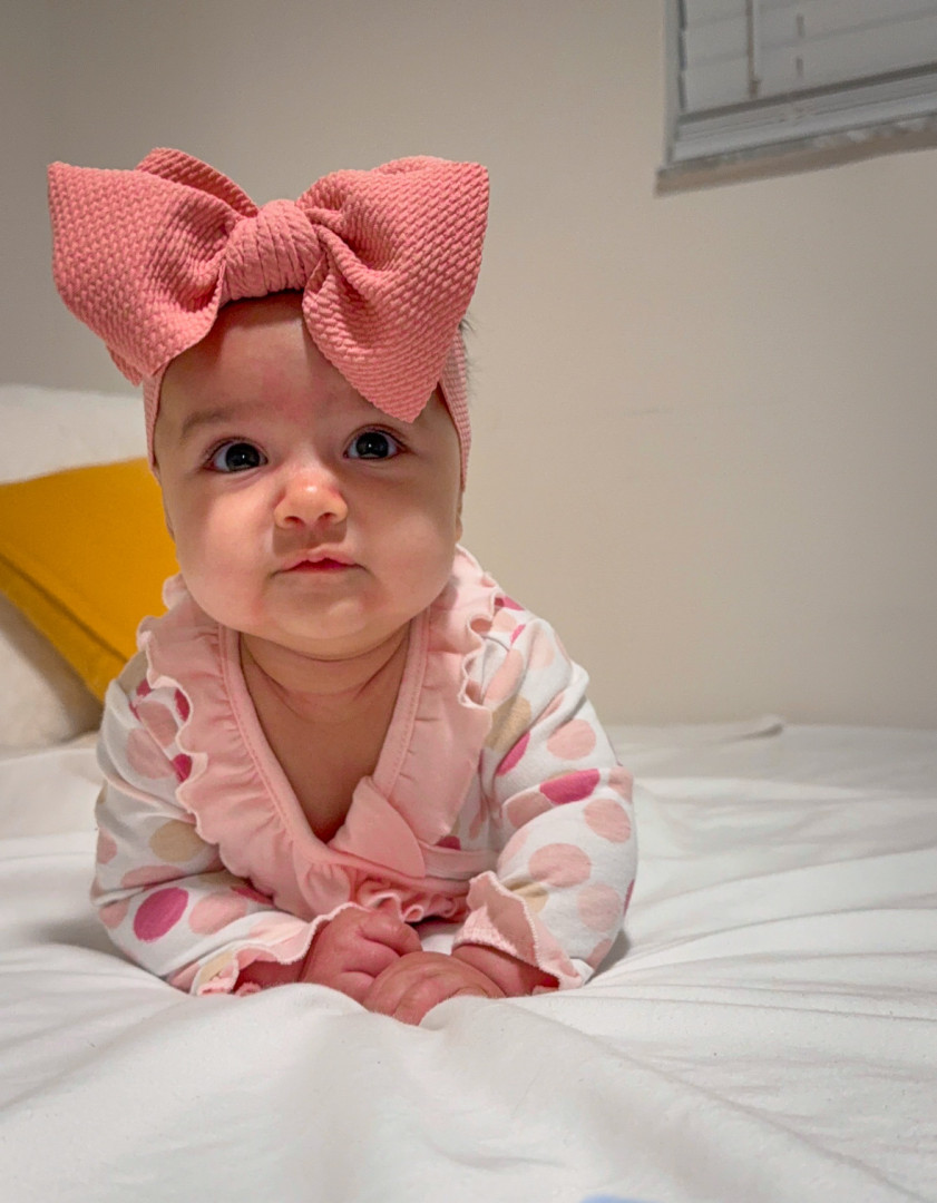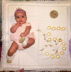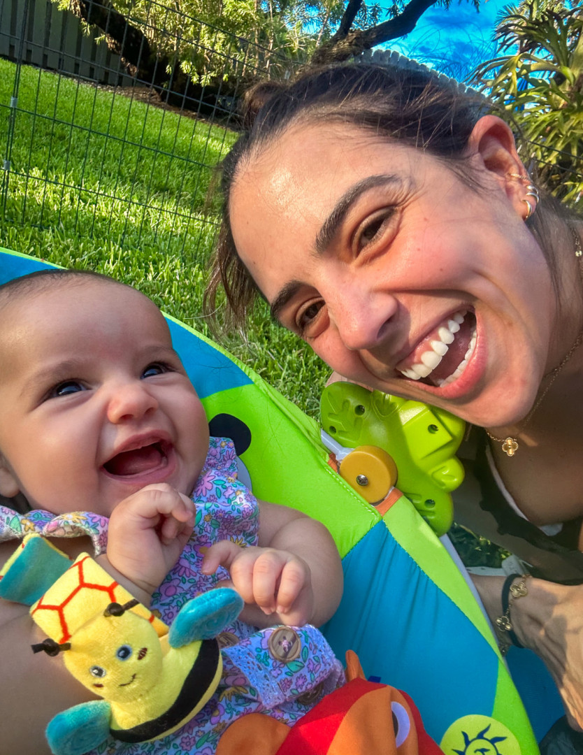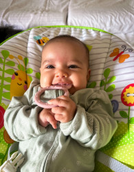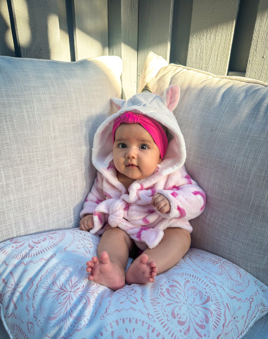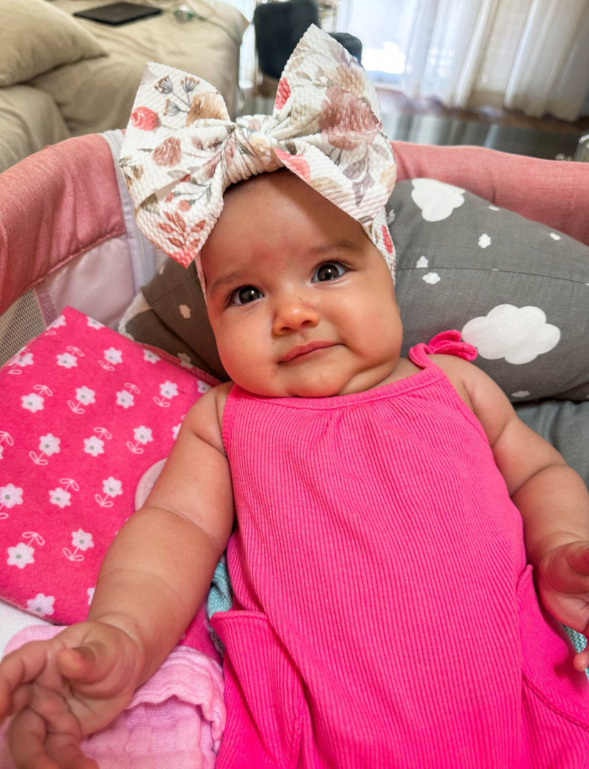 What are Helena's favorite activities?Helena loves greeting ceiling ventilators and even the trees that remind her of them. She rides in her stroller on her tummy, curious about every sight. Music makes her shine, especially when she coos and wiggles to Lilo and Stitch. She babbles as if she’s trying to join the conversation, giggles at herself in the mirror, cuddles her furry sisters Nala and Cloe, adores bath time and baby foot massages, and loves watching mom and dad cook since they are chefs.