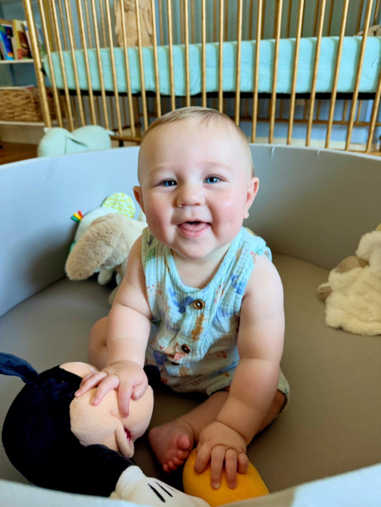Henry is such a bright light, and his personality shines more every single day. He’s curious about everything — always reaching, exploring, and discovering. There’s a little spark of determination in him, whether he’s working hard to grab a toy, practice a new skill, or make sure he’s heard with his expressive squeals and giggles. He’s already so social, with the biggest smiles saved for the people he loves most. His eyes light up when mama walks into the room, and he melts hearts!