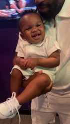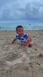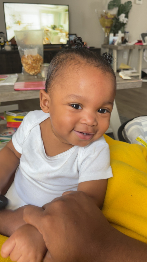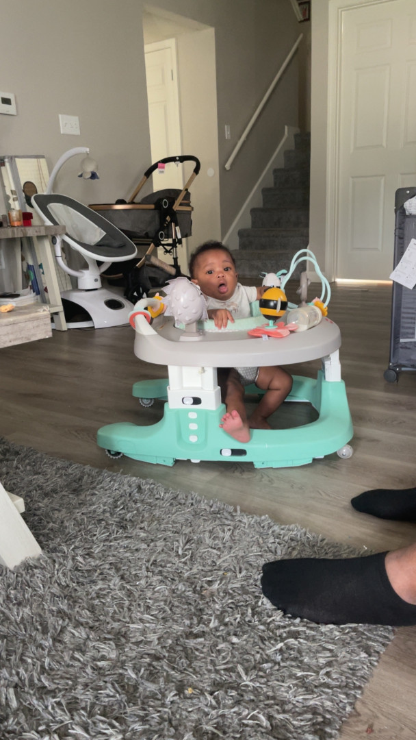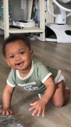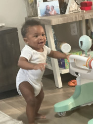 He is such a happy baby. He wakes his sister up with kisses on the morning. He loves food he dances and makes noises while eating. He just started daycare and he brings smiles to everyone faces at daycare he shows his dimples and 4 teeth as soon as we walk in. He tries to jump out of my arms. He’s easily entertained and for the most part he’s always happy. He will look at me and just smile or rub my face in aw. He will have a big amazing heart when he gets older.