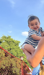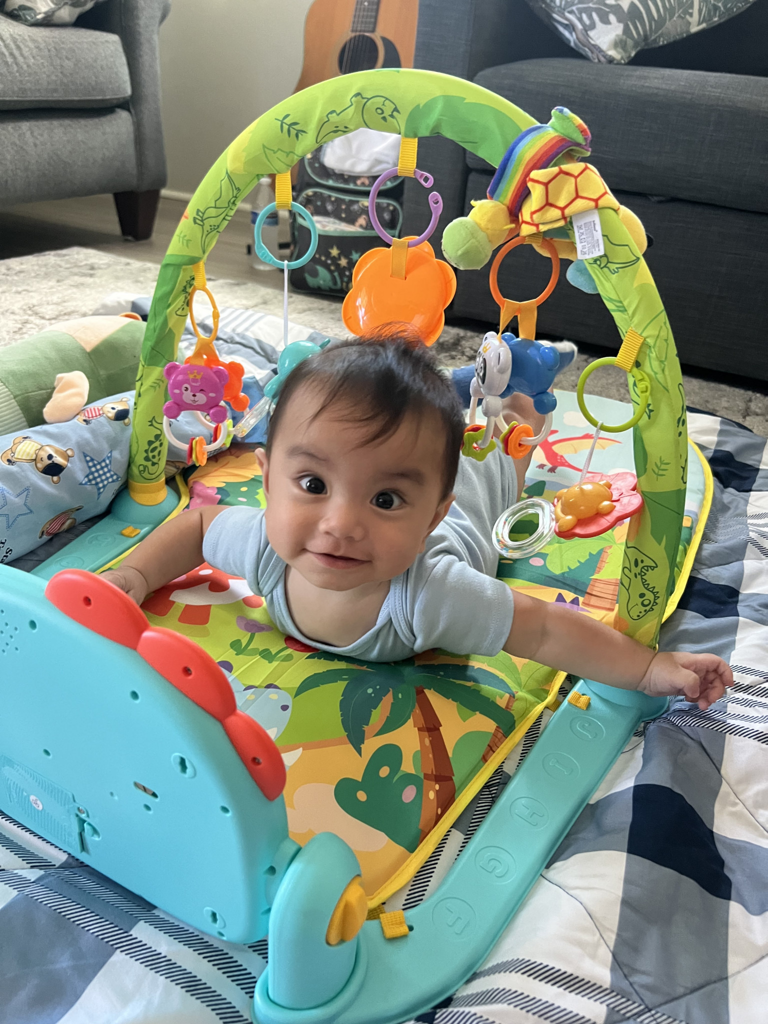 What are Khiristian Jhei Costales Tabucbuc's favorite activities?Khristian Jhei loves being outside the house, he enjoys watching the leaves moving. He also loves crawling on our bed while watching his favorite cartoon "Cocomelon". He loves watching JJ and his favorite song is "Wheel on the Bus".