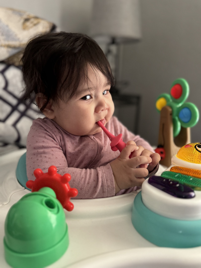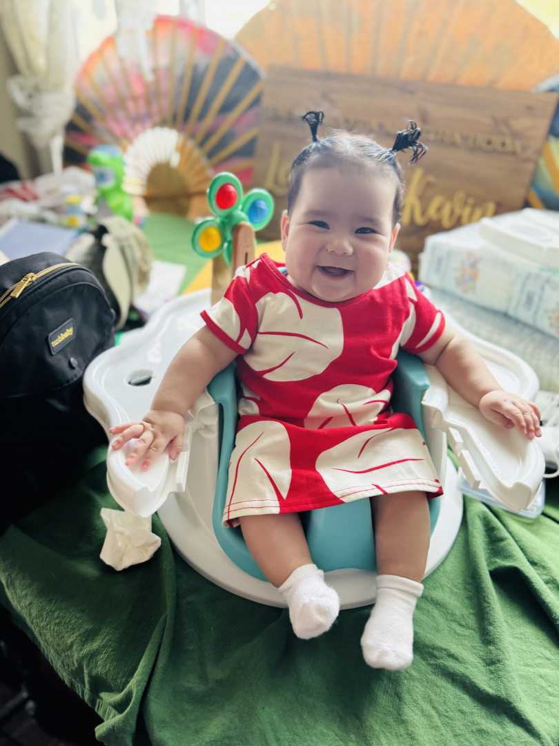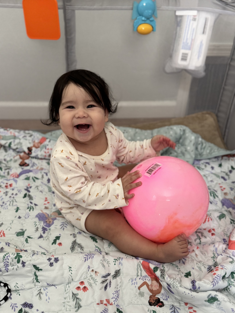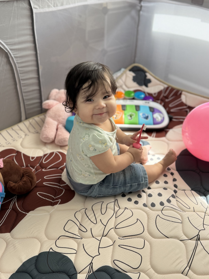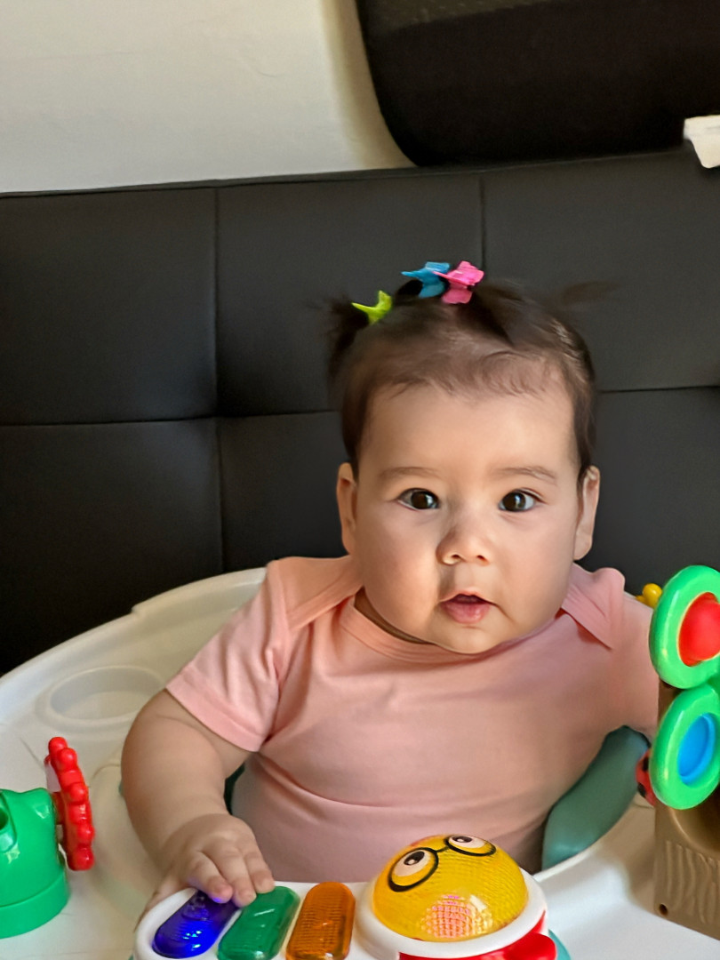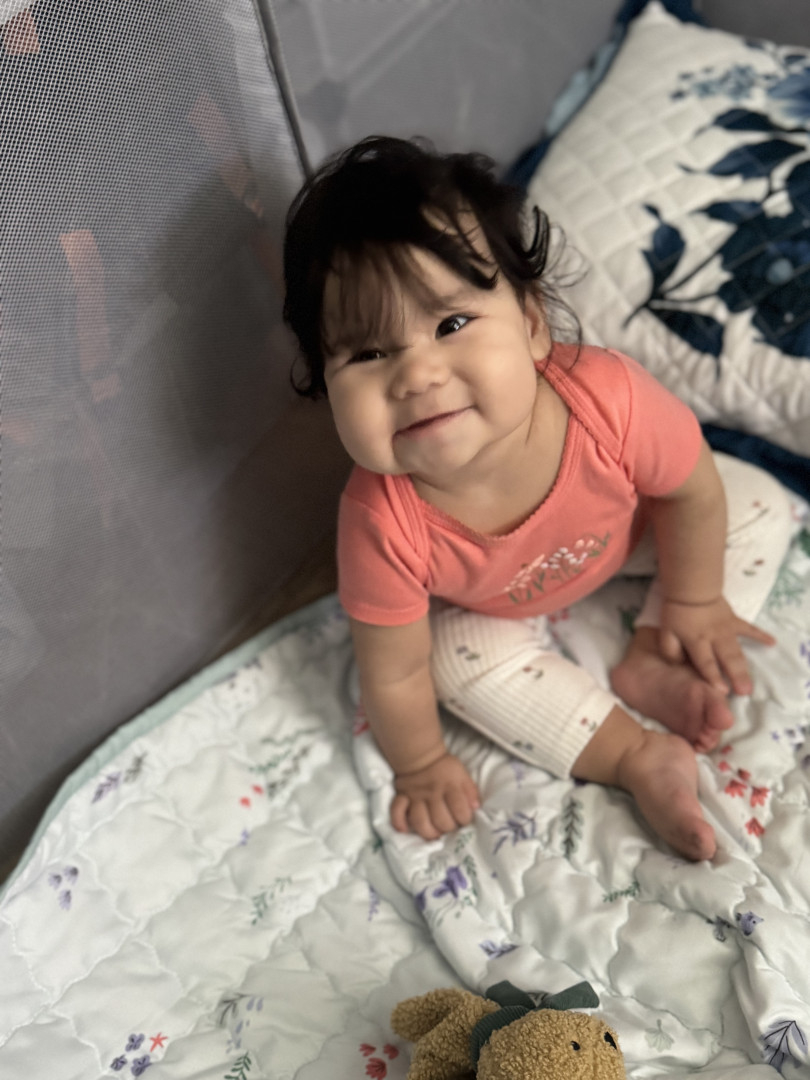 What are Kitana's favorite activities?She’s really into rolling/crawling all over the place. She loves playing with toys that light up or make noise. Peekaboo or me jumping around makes funny noises always gets the best laughs. She’s super curious and always wanting to grab things. Bath time is a favorite too. She can go wild splashing around.