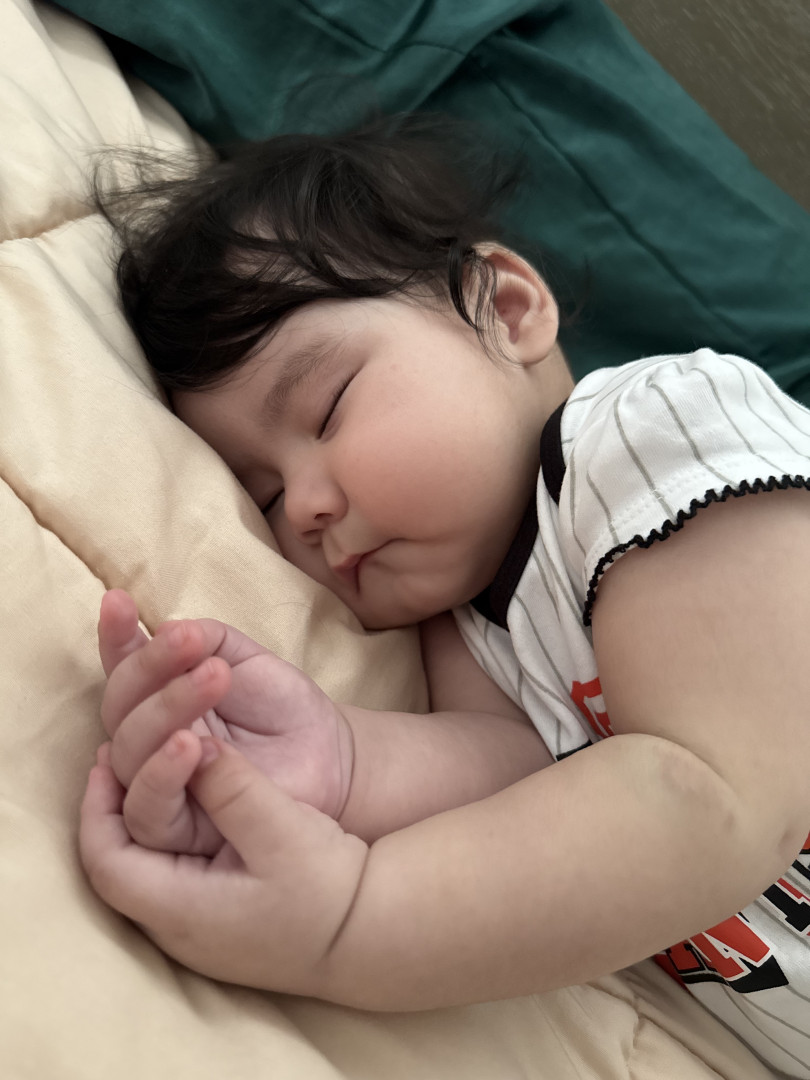 This girl is so silly. She has the most serious faces when she’s not smiling and feels like she’s judging you in a way, but then breaks out in a big ol smile! She loves kicking her feet up in the air and slamming them down on our stomachs when we’re laying down. When she’s tired, she just keeps rolling and rolling and rolling until she finds the right spot, and knocks out. She’s very into babbling now. She’s now waving, giving high fives and just learned how to clap. She’s so smart.