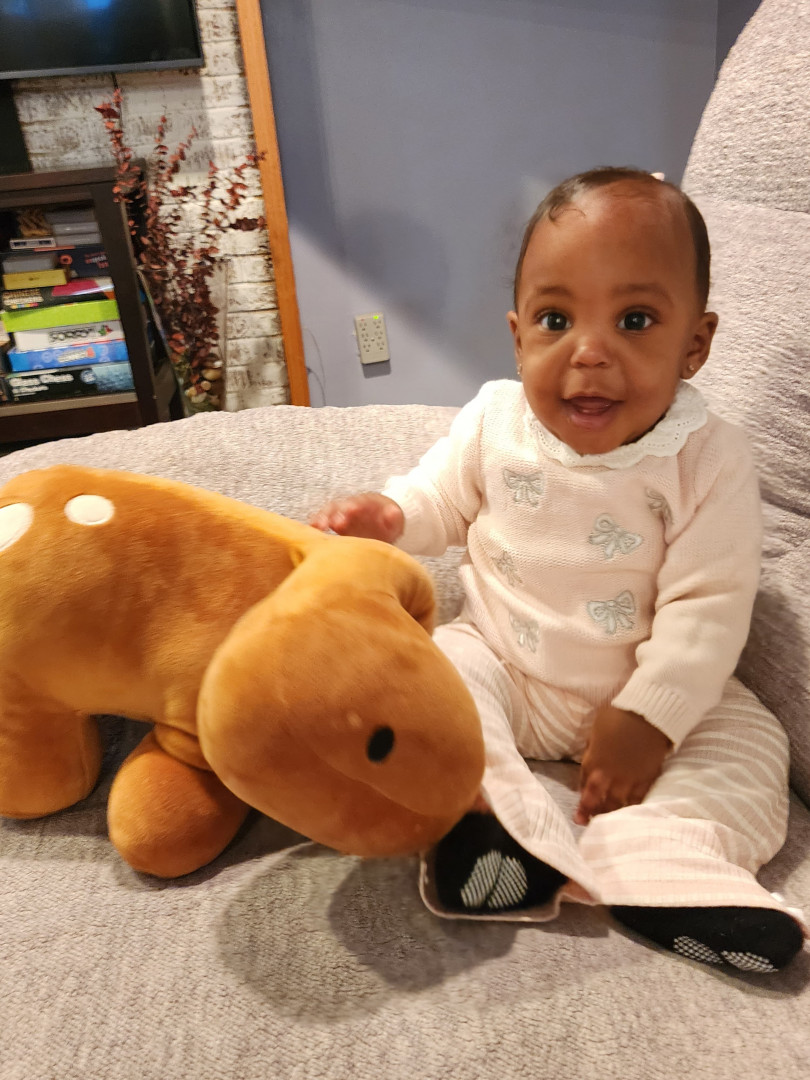 Even at 7 months old, we can tell she is a fun-loving, but a no-nonsense type of girl. Her facial expressions truly tell the story. She loves to be around the action. She is a learner. You can see, in her eyes, how she is taking in her surroundings and processing information. She is a lover of music.
