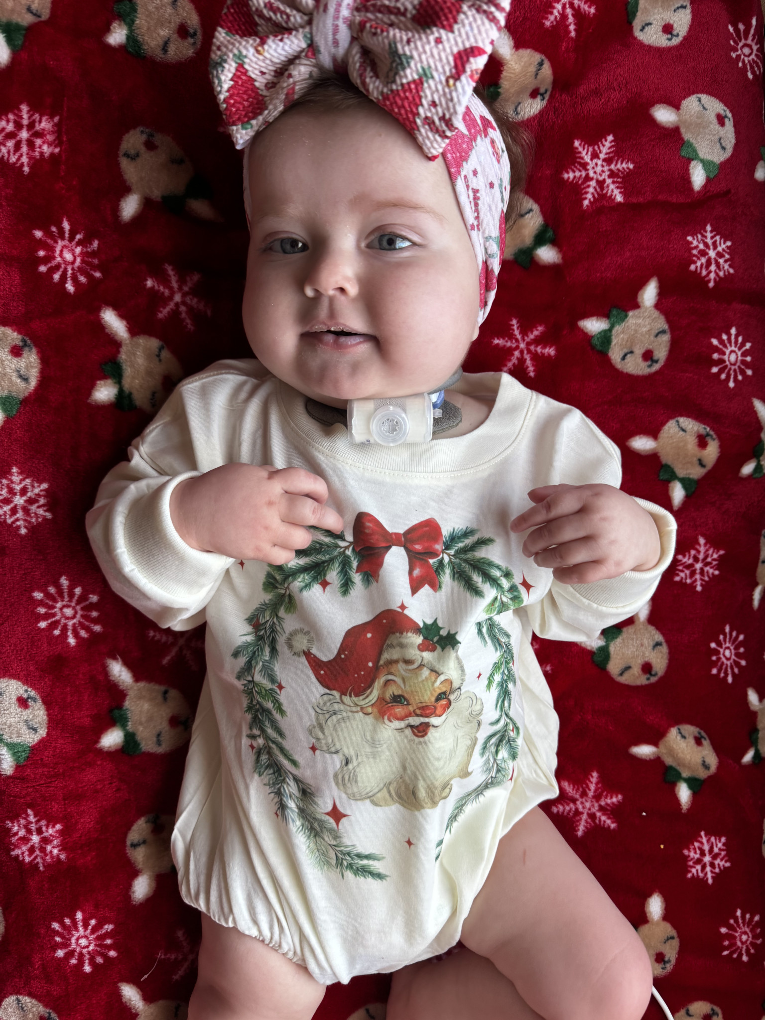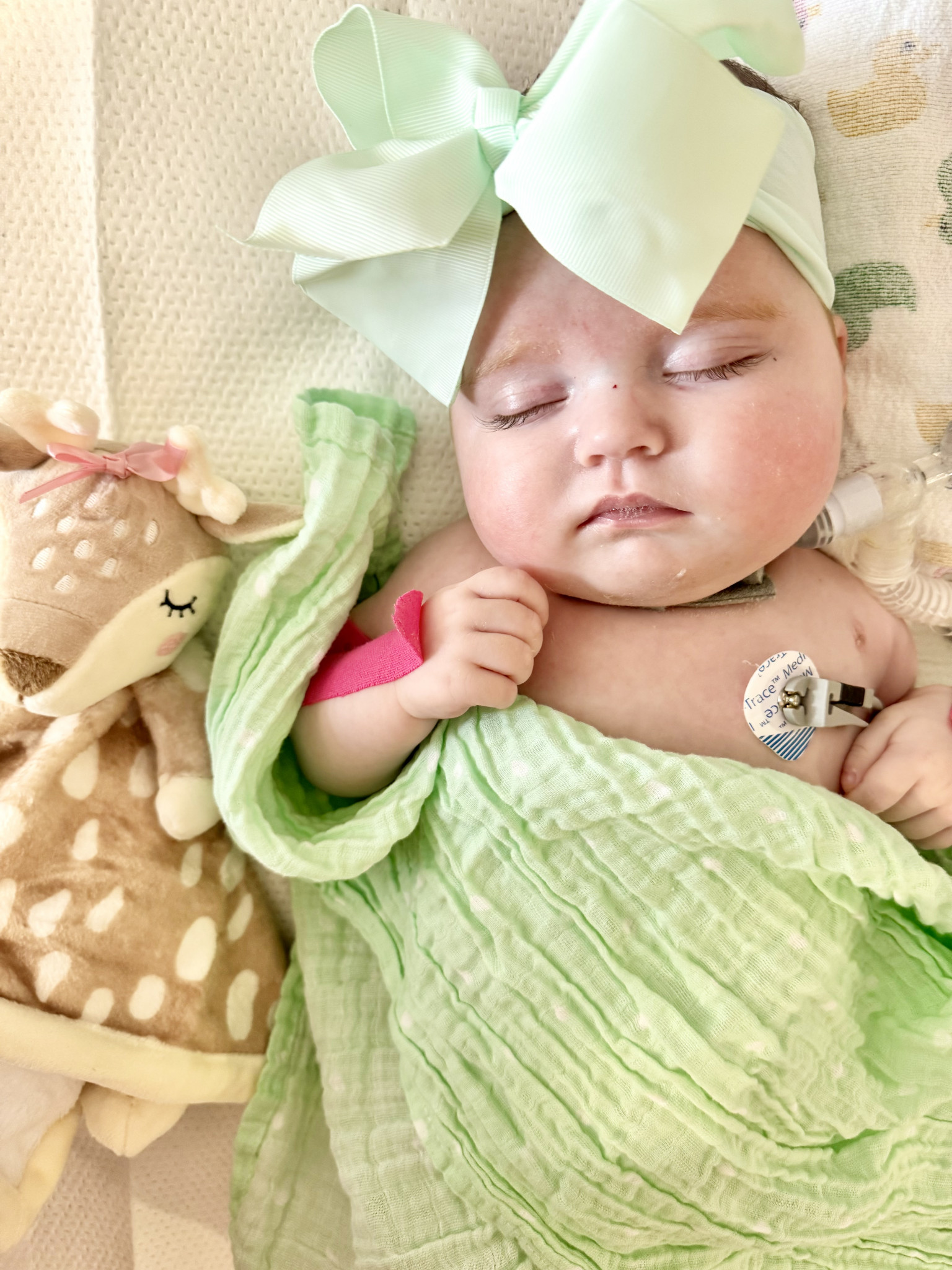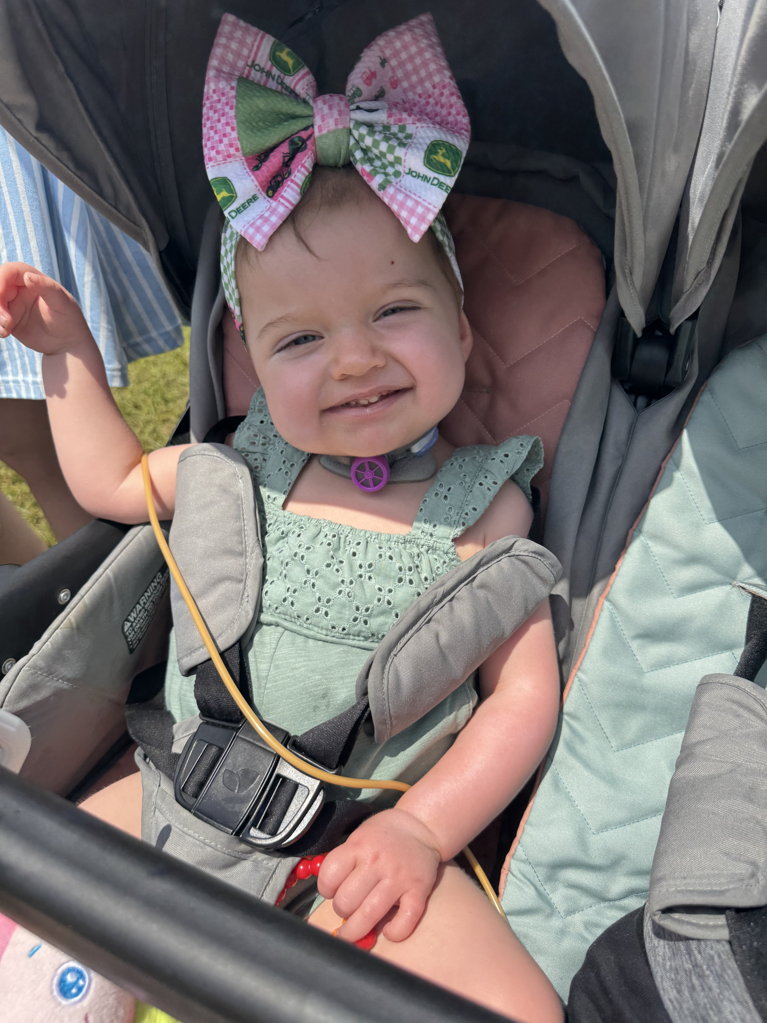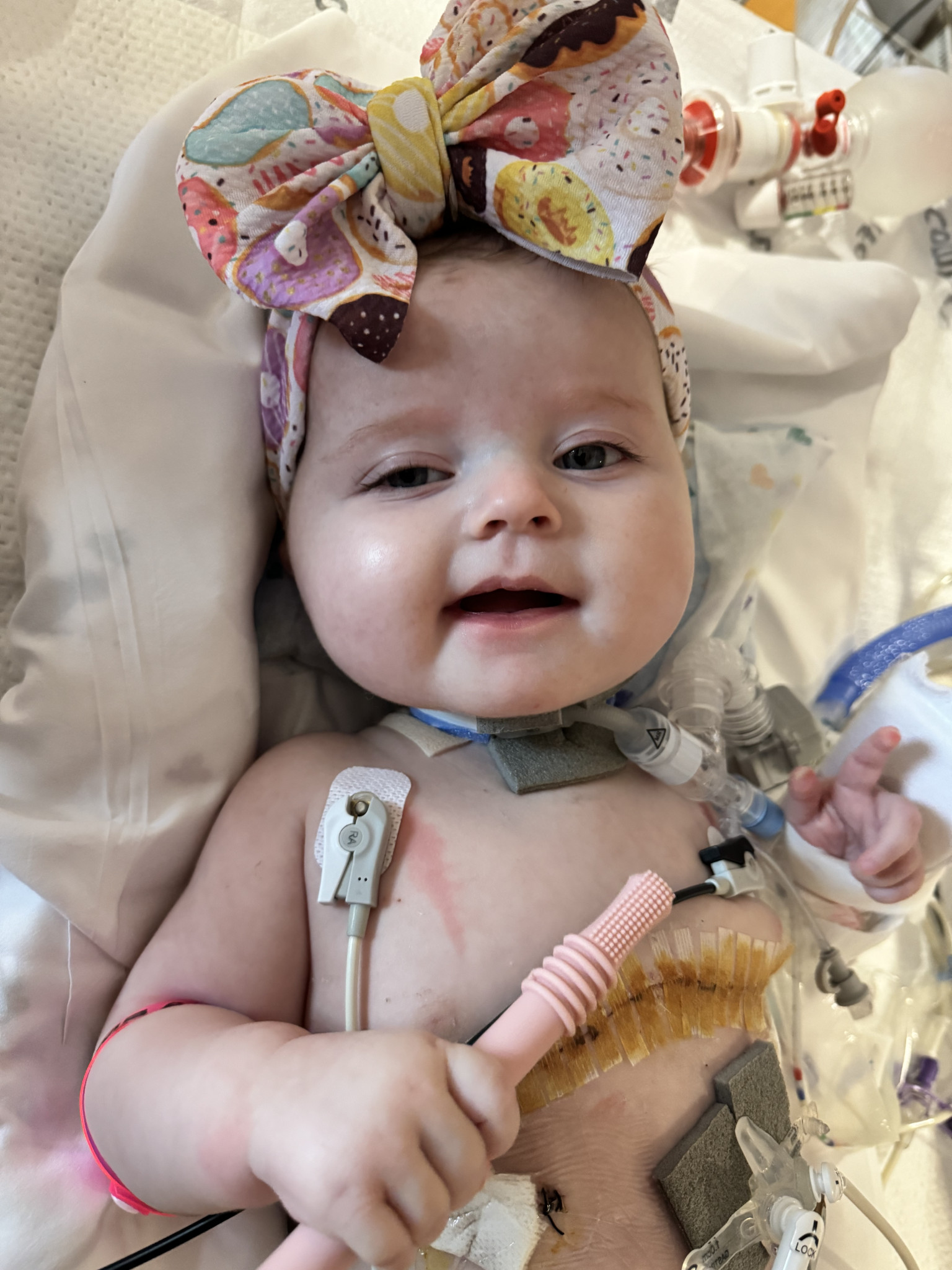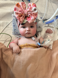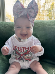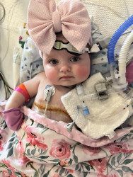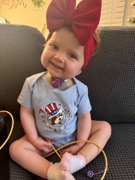 Kylie is the happiest baby you will ever meet, despite all she has been through. She attends multiple therapies and doctor appointments each week and she loves to trick her therapist by pretending she is sleeping when she doesn’t want to do therapy. We all get a good laugh out of it. We travel the 26 hours to Texas every three months for biopsies and to see our transplant team, Kylie hates sitting still in the car but once she is out then she is ready to make others smile.