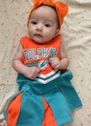 What are Leyla Fernandez's favorite activities?Leyla loves to play with her Winnie the Pooh mobile throughout the day. She’s also got a thing for fitness as you’ll see her doing leg raises and lifting her dumbbell shaped rattle. Saturday mornings she hangs with her dad on the rocking chair and watches College Gameday with him! Leyla loves to also spend time with her fur brother Parker.