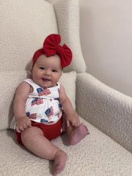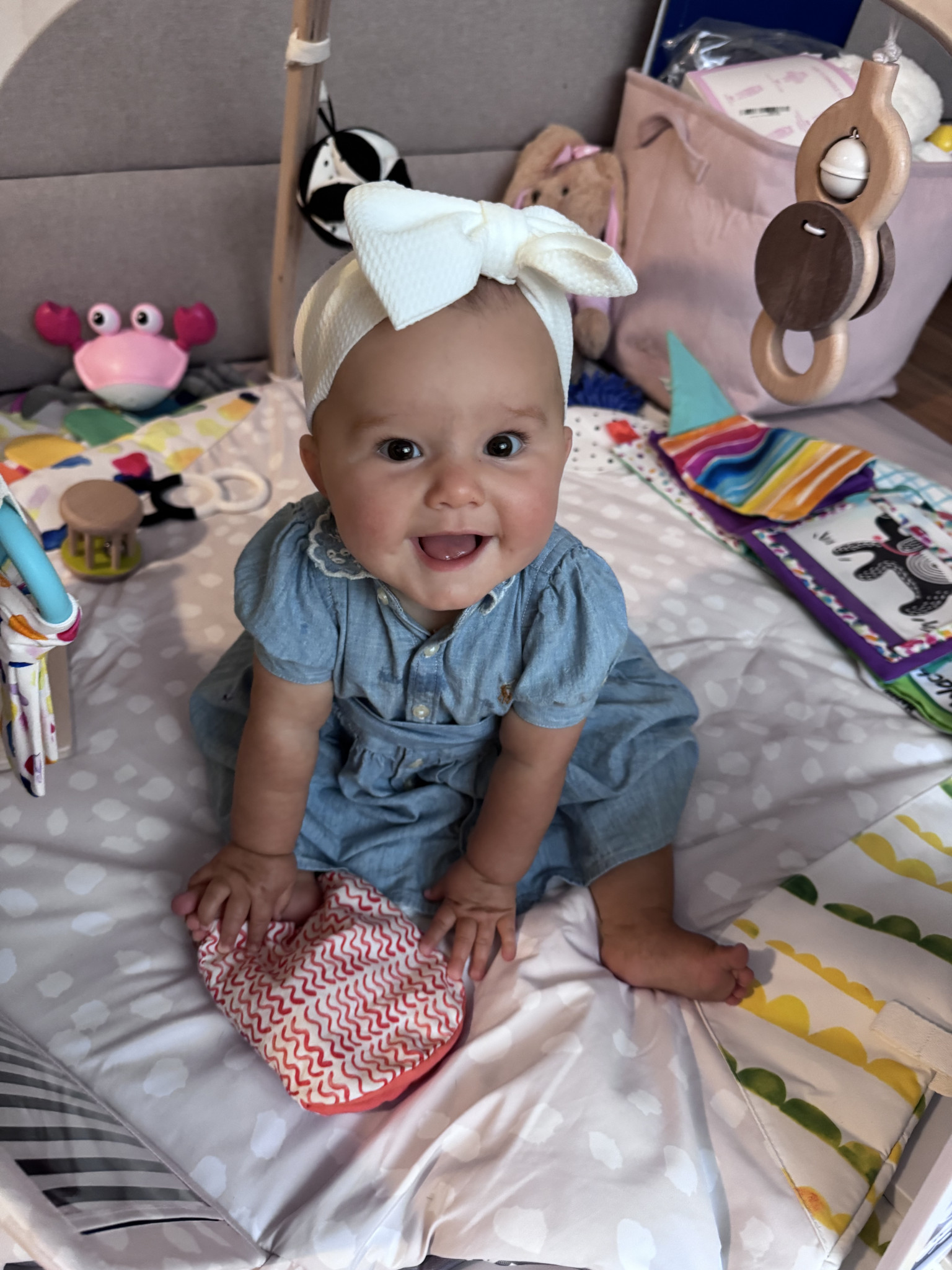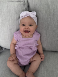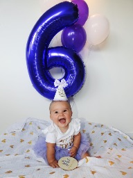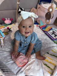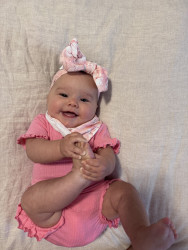 At 6 mos old Leyla starts her day with a smile She wakes up smiling and giggling every single day since she was a newborn! Leyla has a silly personality, she loves to smile and giggle all day long thinks any thing you do is funny. She is a people person. But she is also a strong and fierce baby girl she is super determined to reach her milestones, excelling at every stage!