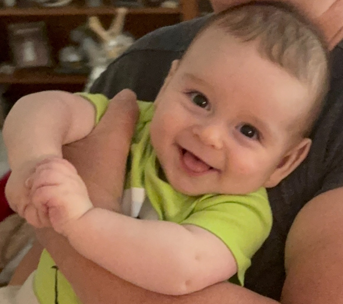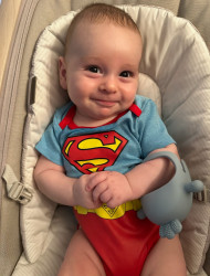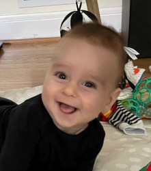Luka loves to smile, crowl, play with feet, play with dofferent toys, sing eith his daddy.