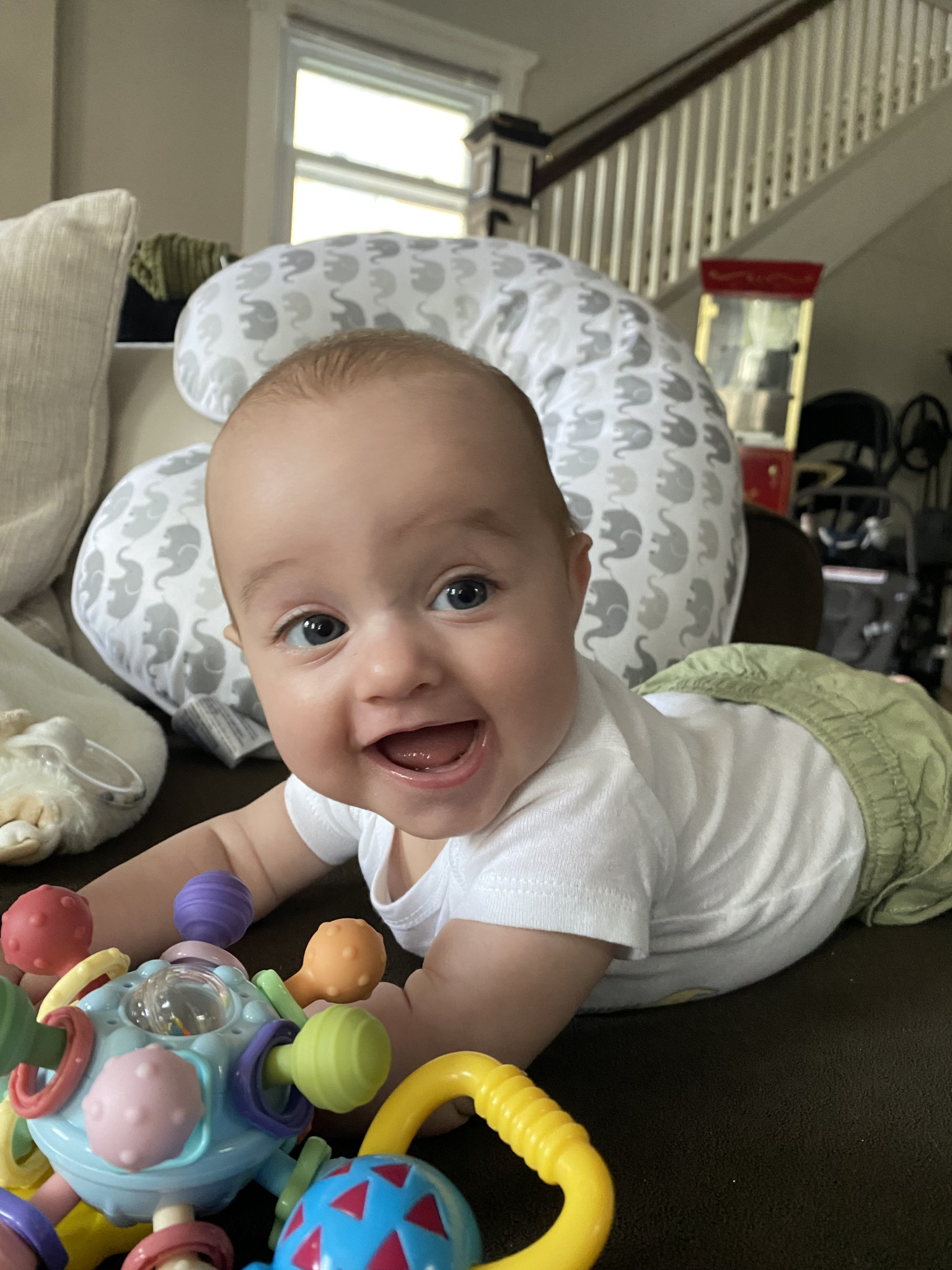 What are Lukas's favorite activities?Currently he loves to roll around in his play gyms and put anything he can grab in his mouth.