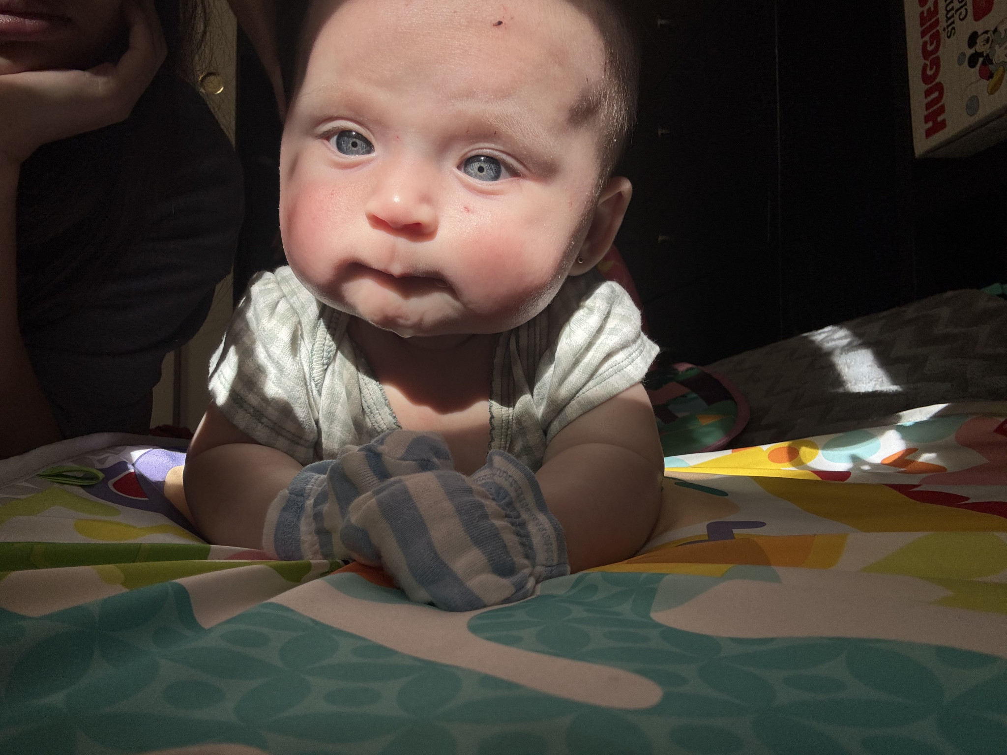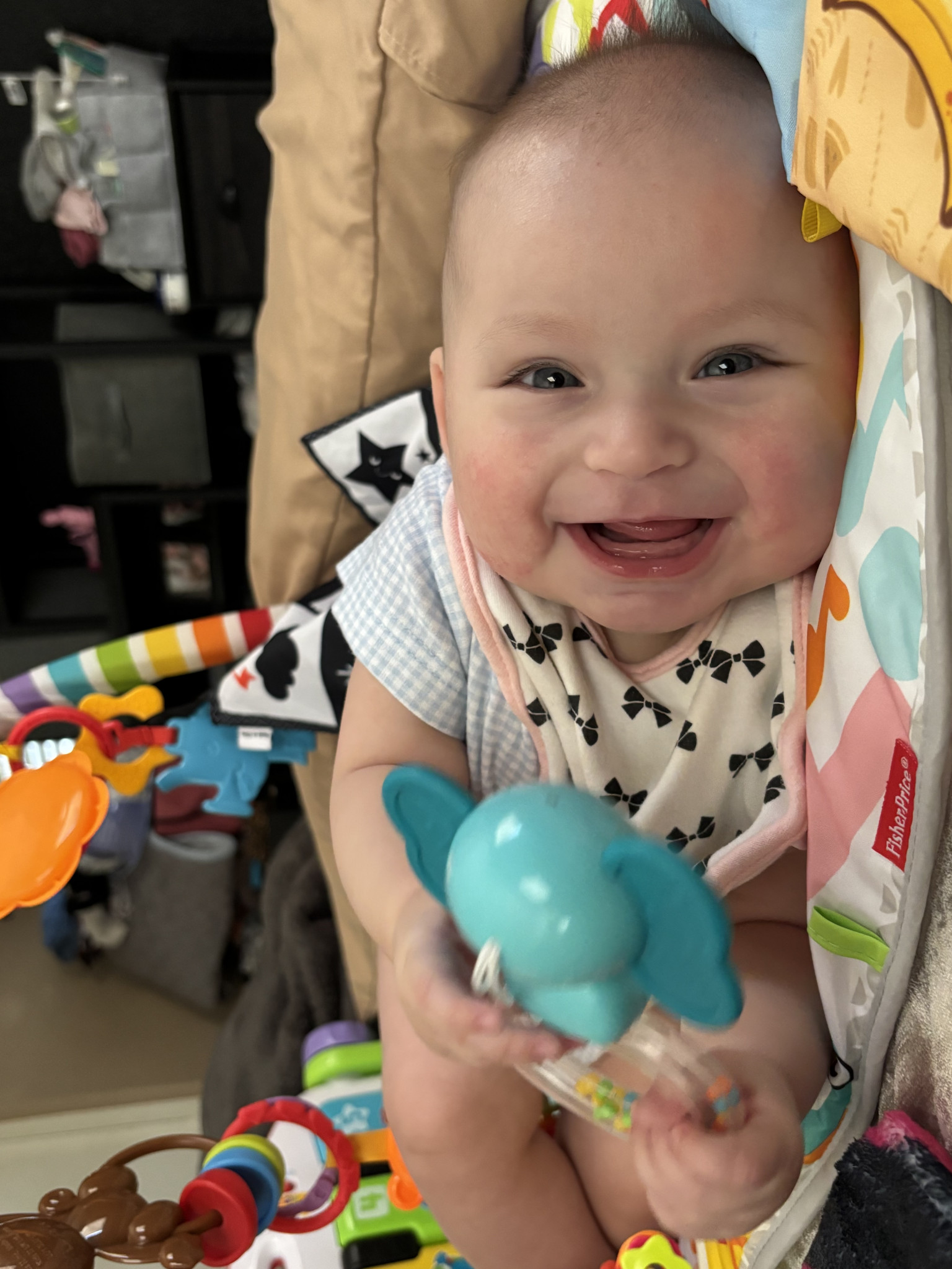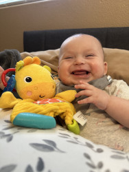 People have said they never see a baby smile at EVERYTHING!Loves pics & looking in mirror.She falls asleep with a little grin.Happiest baby!