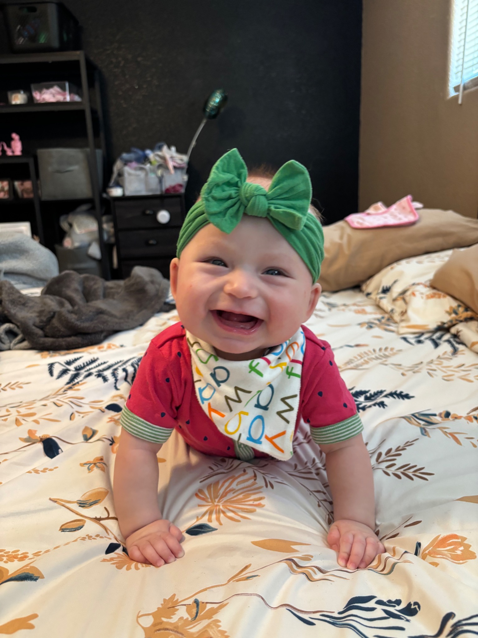 Super bubbly! Everything is funny to her. Very independent already and does not need mommys cuddles when play time is serious! Daddys girl though forsure! Loves music and when someone sings to her. She smiles at everything! It is not hard to make babygirl happy. She already loves dogs. Wakes up in the morning and instead of being fussy.. we wake up to her cute attempt of singing and talking to herself