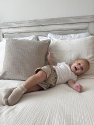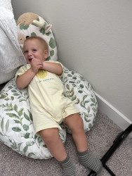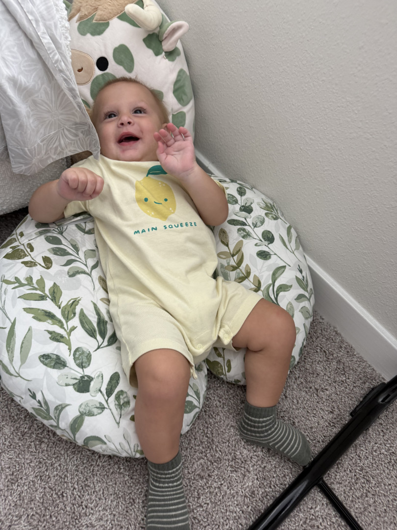 He’s very spunky and determined. He figures his toys out and is cheeky while doing it. He gives you little smirks and crawls away very fast like he wants you to chase him. I catch him and tickle him and he loves to laugh and laugh. Such a cutie personality.