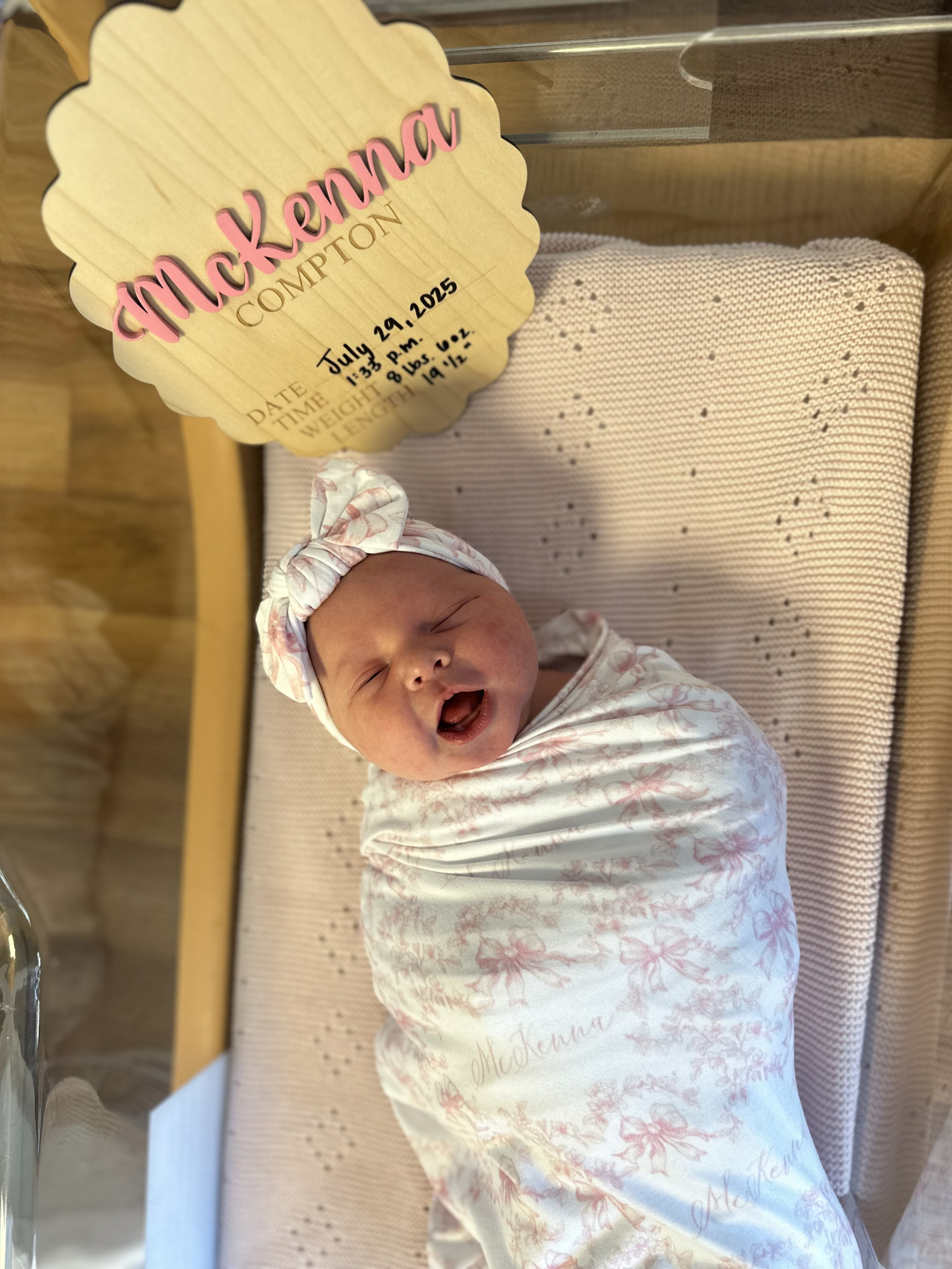 What are McKenna Compton's favorite activities?McKenna loves tummy time, listening to music, and giggling during playtime. She enjoys snuggles with mom and dad, watching the world with wide-eyed curiosity, and showing off her big smiles. Her newest favorite? Kicking her little legs like she’s already ready to race!