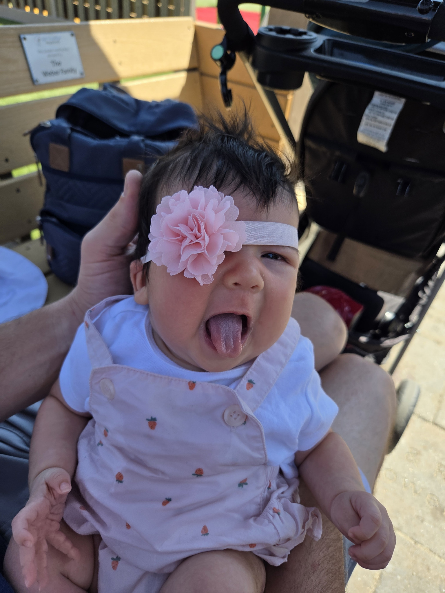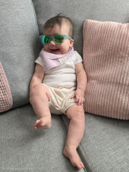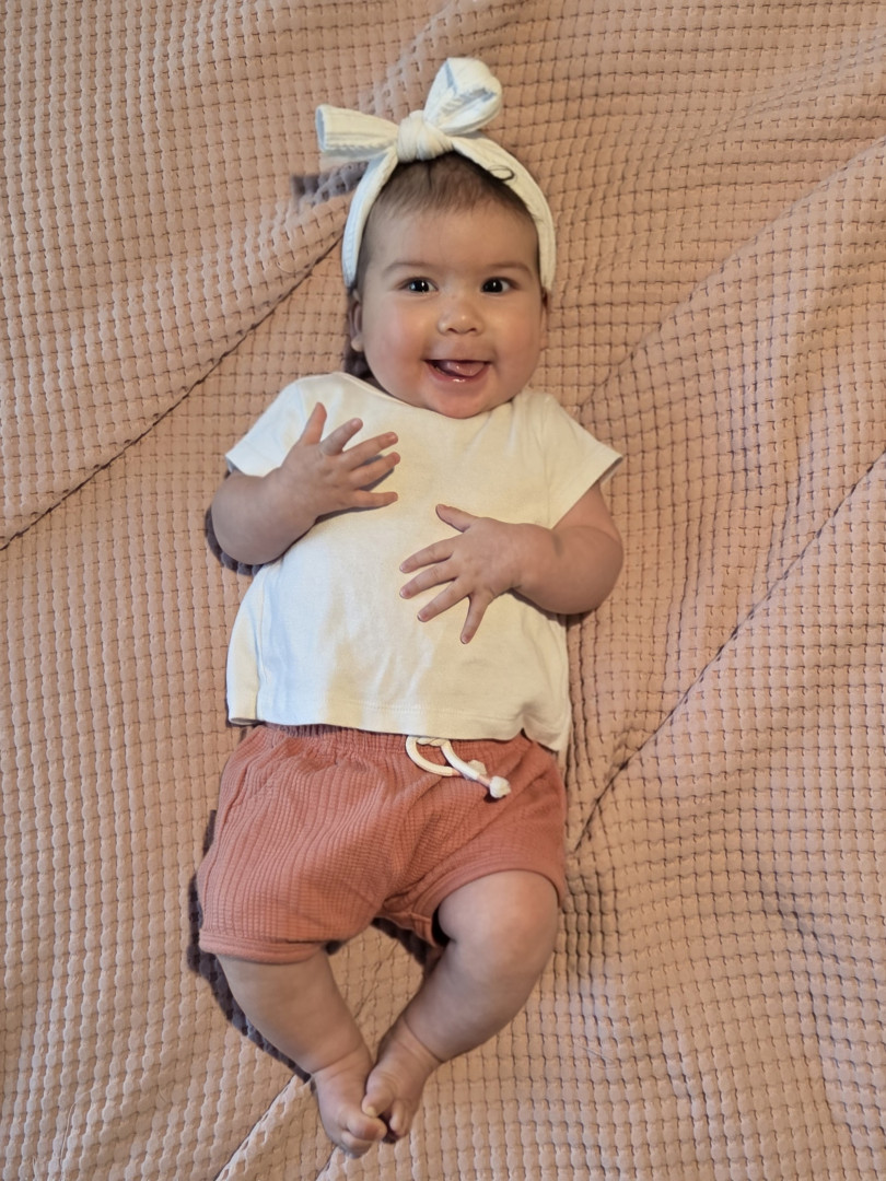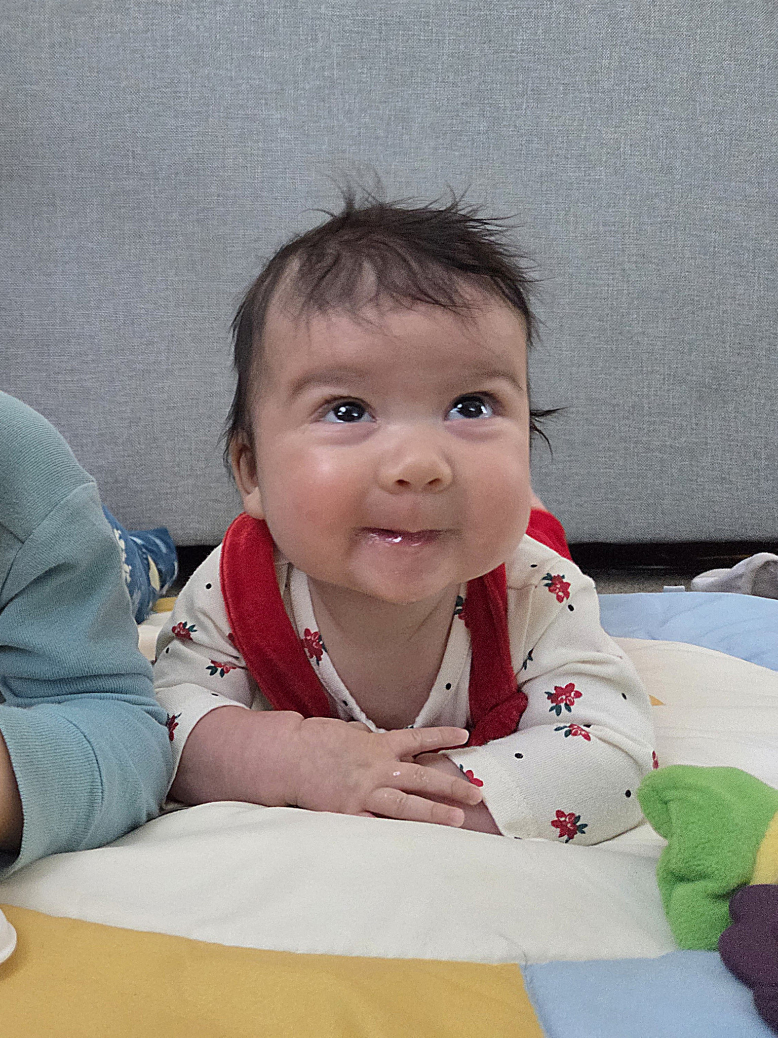 What are Mei's favorite activities?Aside from the usual baby favorites of eating, sleeping, and the occasional spitting up, Mei loves having a good chat with you whenever you're available or when you're not. She absolutely enjoys tagging along with squats during exercise time. For her own wiggly leg exercises, she appreciates a good crinkle book at her feet. You can also find her tongue sticking out nine times out of ten.