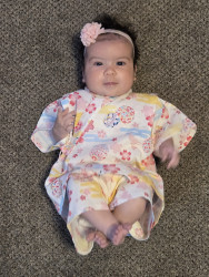 Mei can be quite the babble baby. When she first wakes up to just before calling to be fed she is cooing and oo-ing. She loves being talked to as well. She responds as if she were contributing to the conversation. She's so fun that way. She also loves being where the people are, where the action is. She is a determined little gal; she seems to want to run before she can even army crawl. She'll be a force to be reckoned with, a force for good, as she grows older.