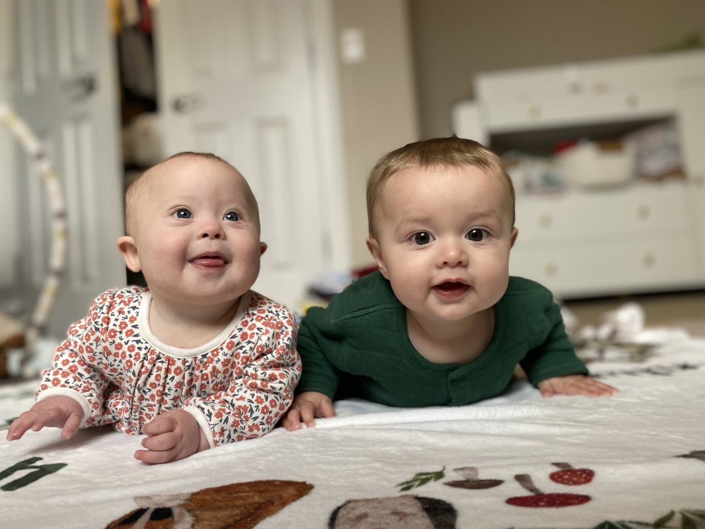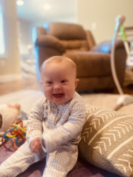 What are Olive Joy's favorite activities?She loves hanging out on her tummy with her toys with her twin brother. They spit and make babbling sounds at each other. Sometimes she even shares her toys with him when he quickly grabs them away from her. Olive loves interacting with her 3 older siblings. They read books, sing and play with her on the play mat.