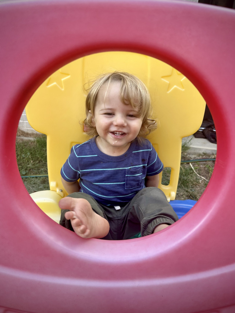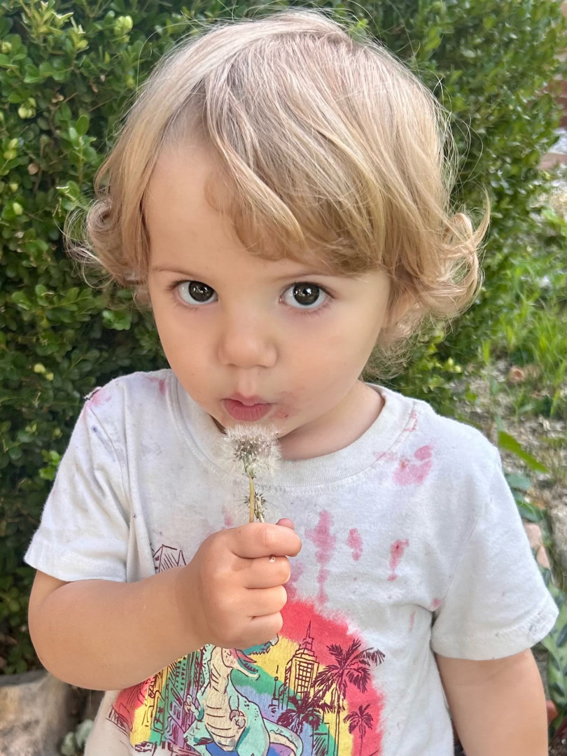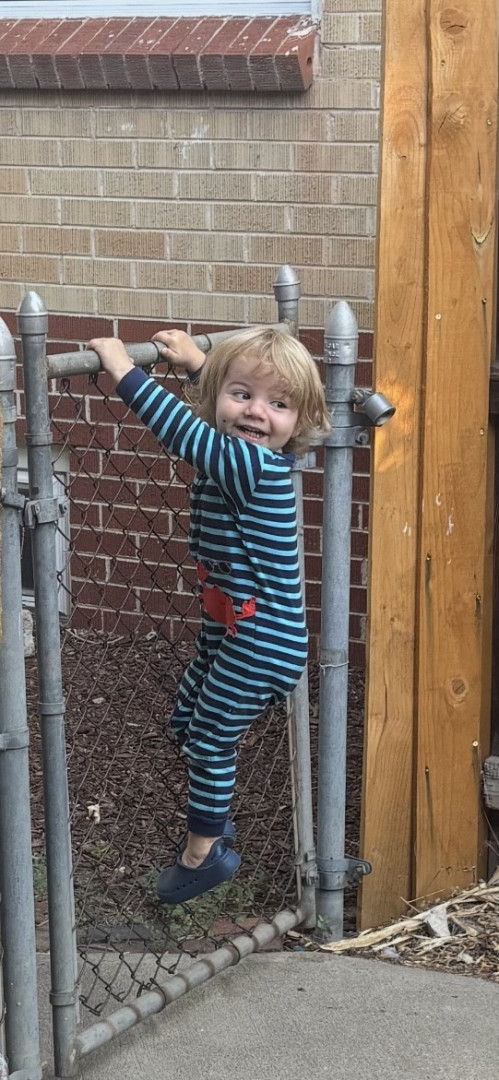 He’s our little comedian—always making funny faces and silly noises just to get us giggling. Super friendly, he says “hi” and “bye” to everyone we pass when we’re out—he’s never met a stranger!
