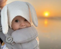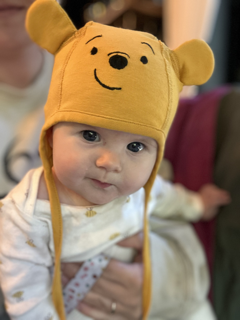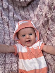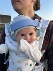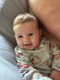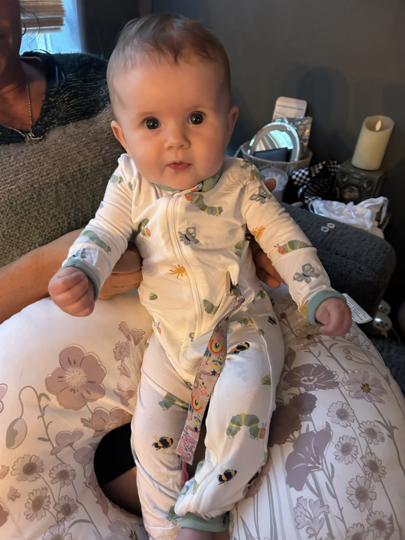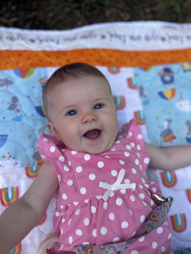 What are Ronin May's favorite activities?Ronin’s favorite activities are playing with her toys, watching her dogs play with each other, going on walks to the beach, sitting outside under the trees, and taking long naps. She also likes tummy time and is starting to learn how to use her leg muscles to move!