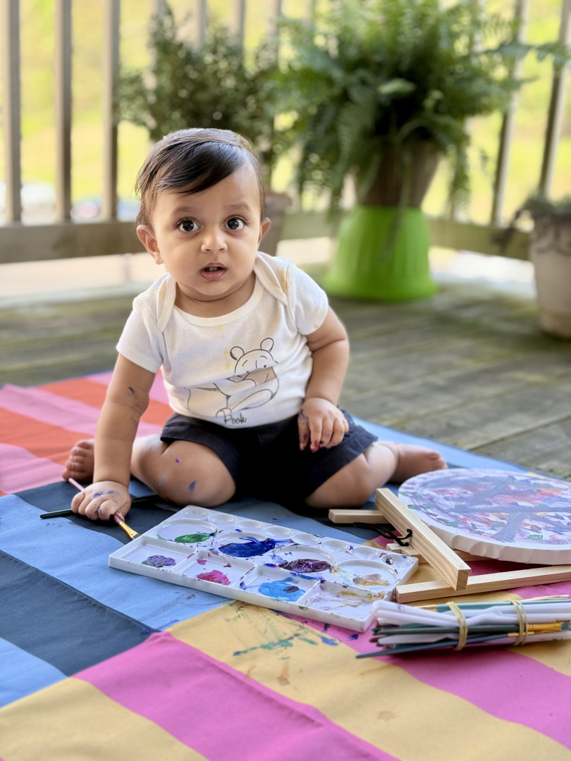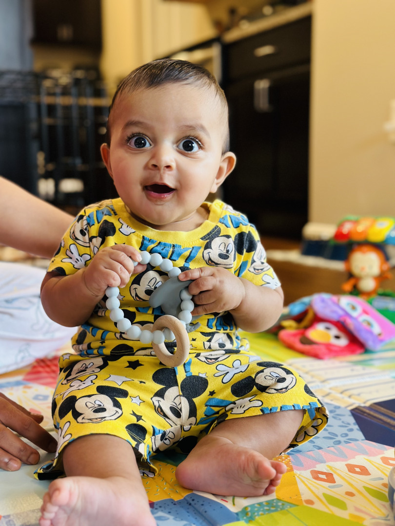 What are Rovin Mithra's favorite activities?He makes sure things are in place, like setting up the bed after waking and putting shoes in the shoe stand when coming home. He enjoys rhymes and loves dancing with Mom to the songs. Ocassionally likes to watch Ms. Rachel and animal documentary videos. He likes to sit outside the house and monitor trucks, puppies and airplanes like a watchdog.