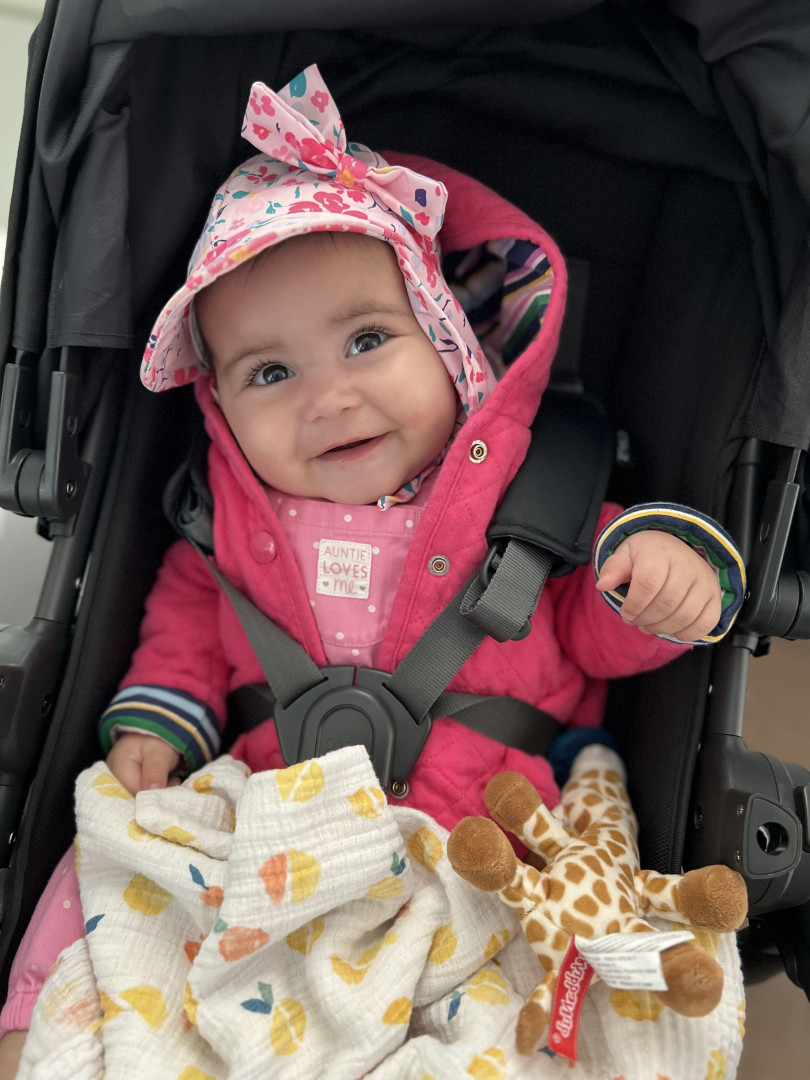 What are Samara Jagan Menard's favorite activities?Samara loves story time, bouncing in her BabyBjörn, stroller walks, and snoozing in the car. She lights up when her mom sings “Wheels on the Bus,” adores playing with her stuffed doll, and - when she thinks no one’s watching - sneaks peeks at the TV before getting caught! Her days are full of giggles, movement, and just the right amount of mischief.