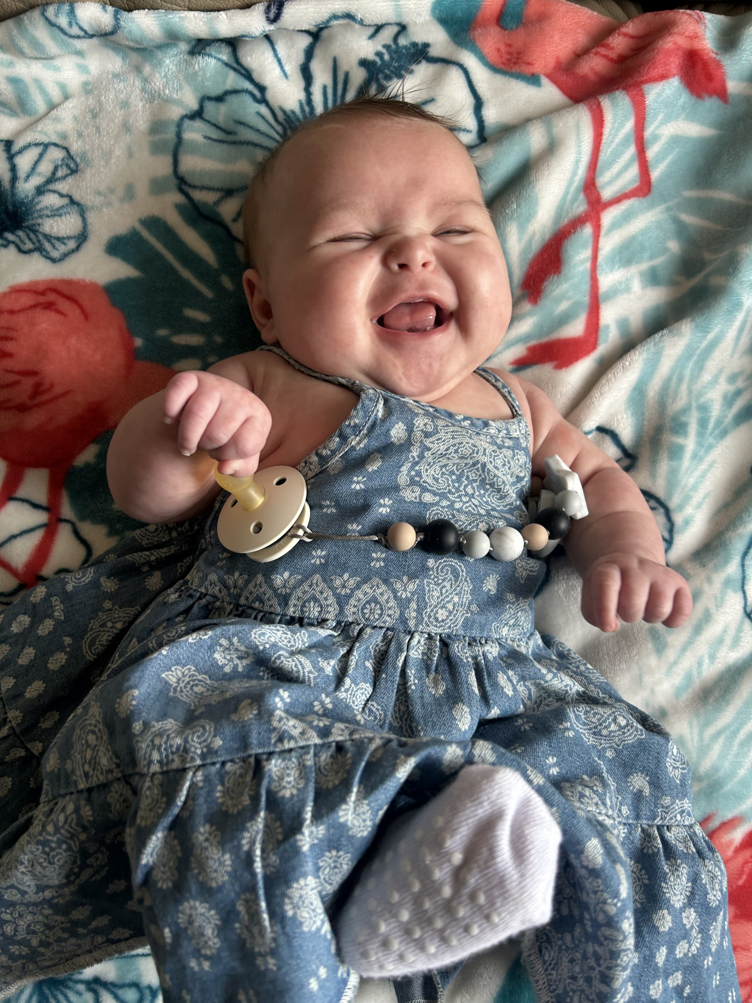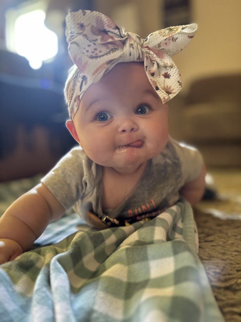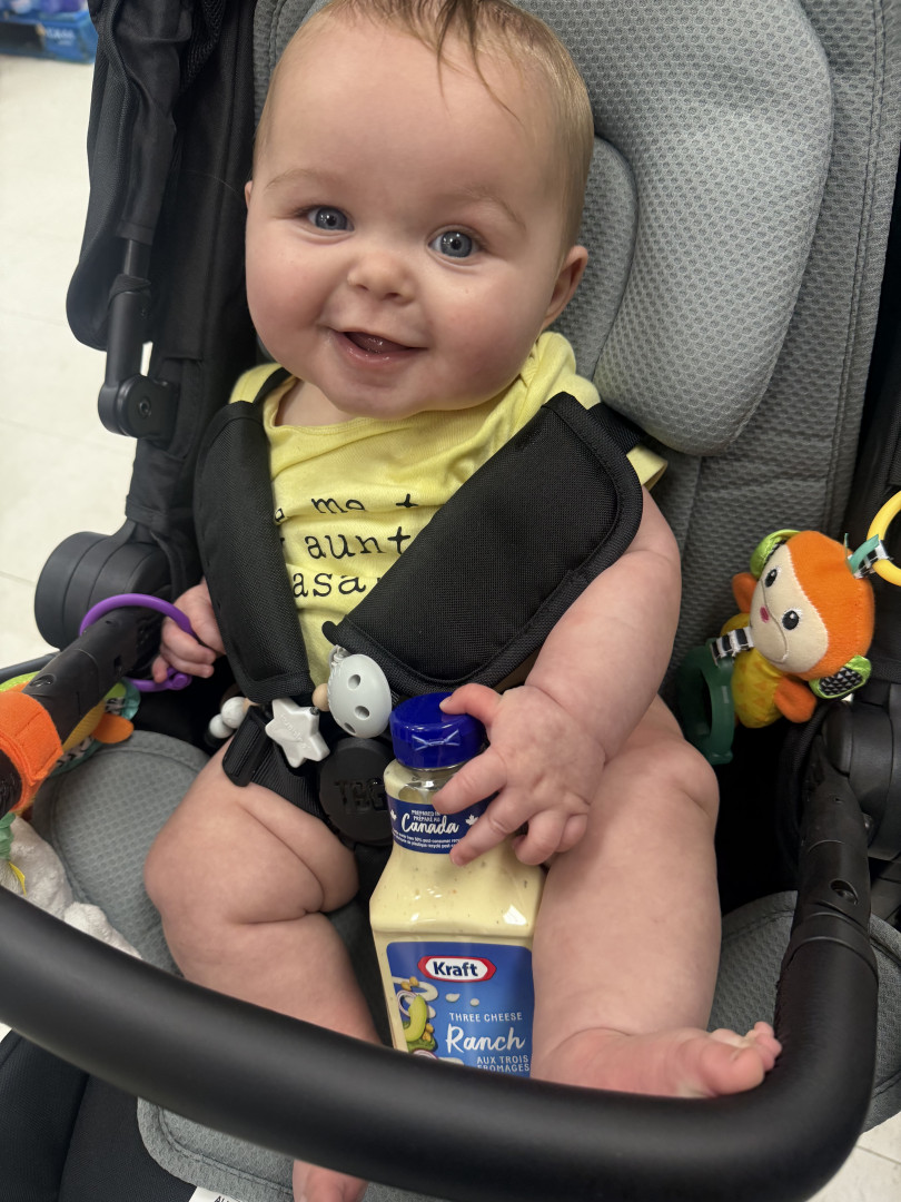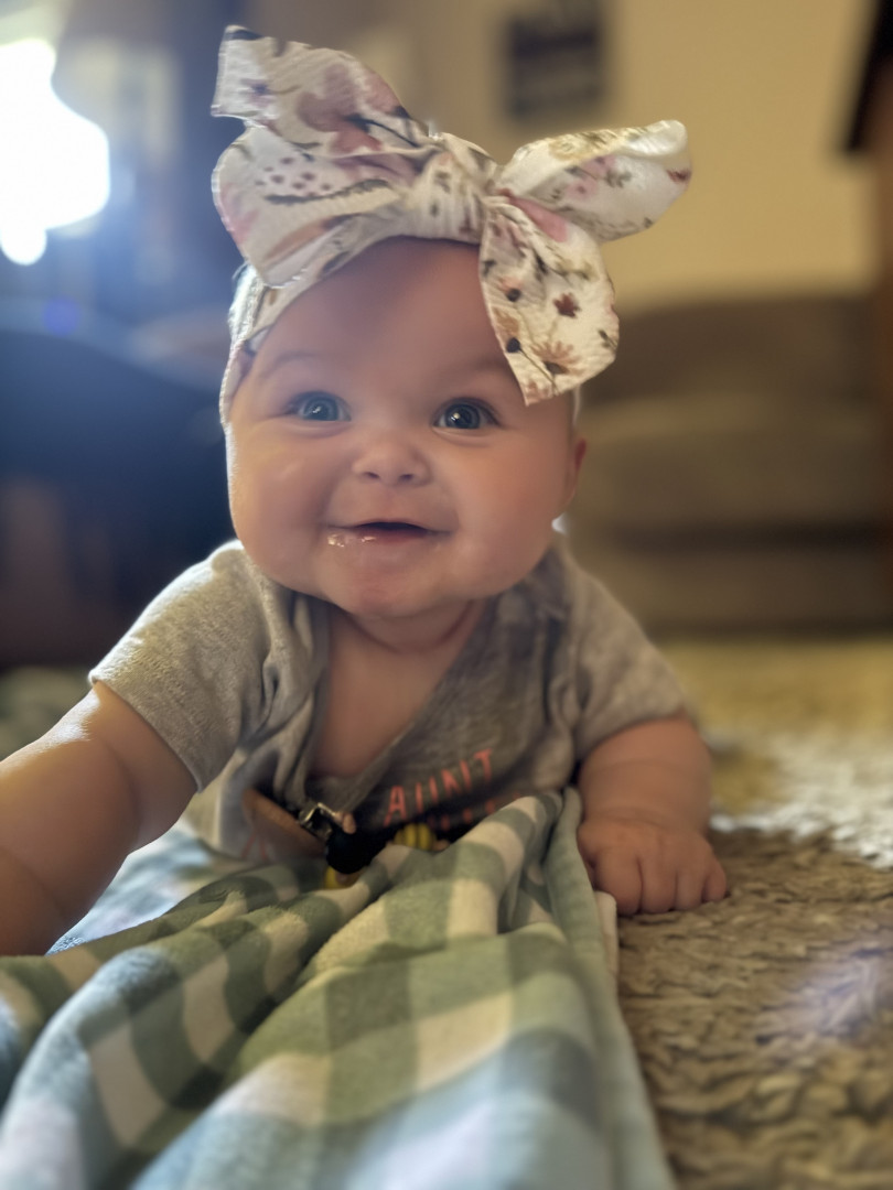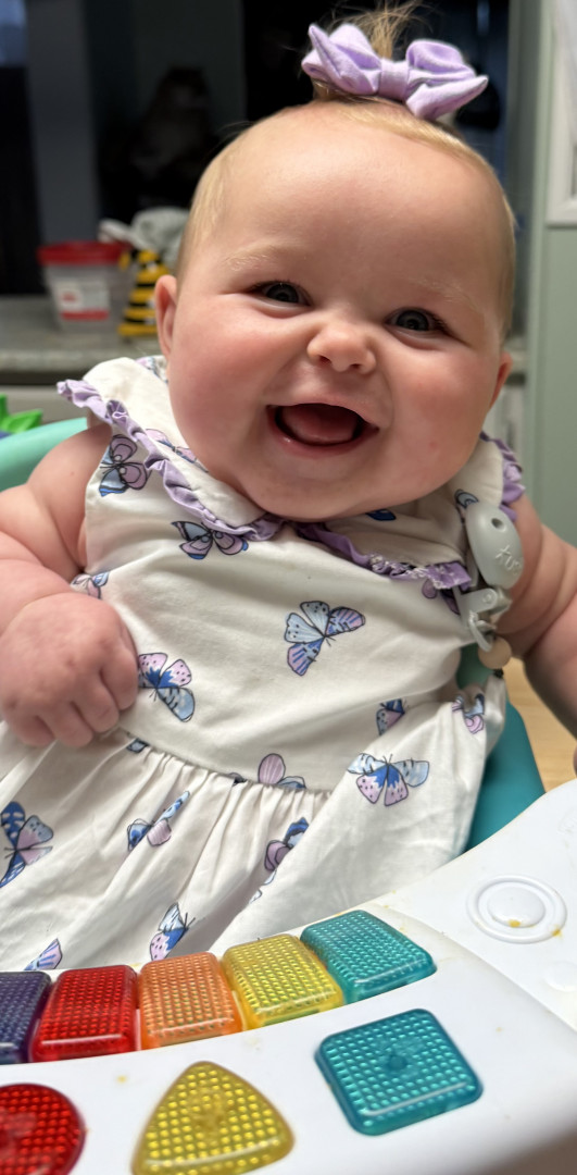 She’s a bubbly baby who always has a smile to share. Unless it’s dinner time then she double fists spoons and gives a war cry that would make the Spartans run.