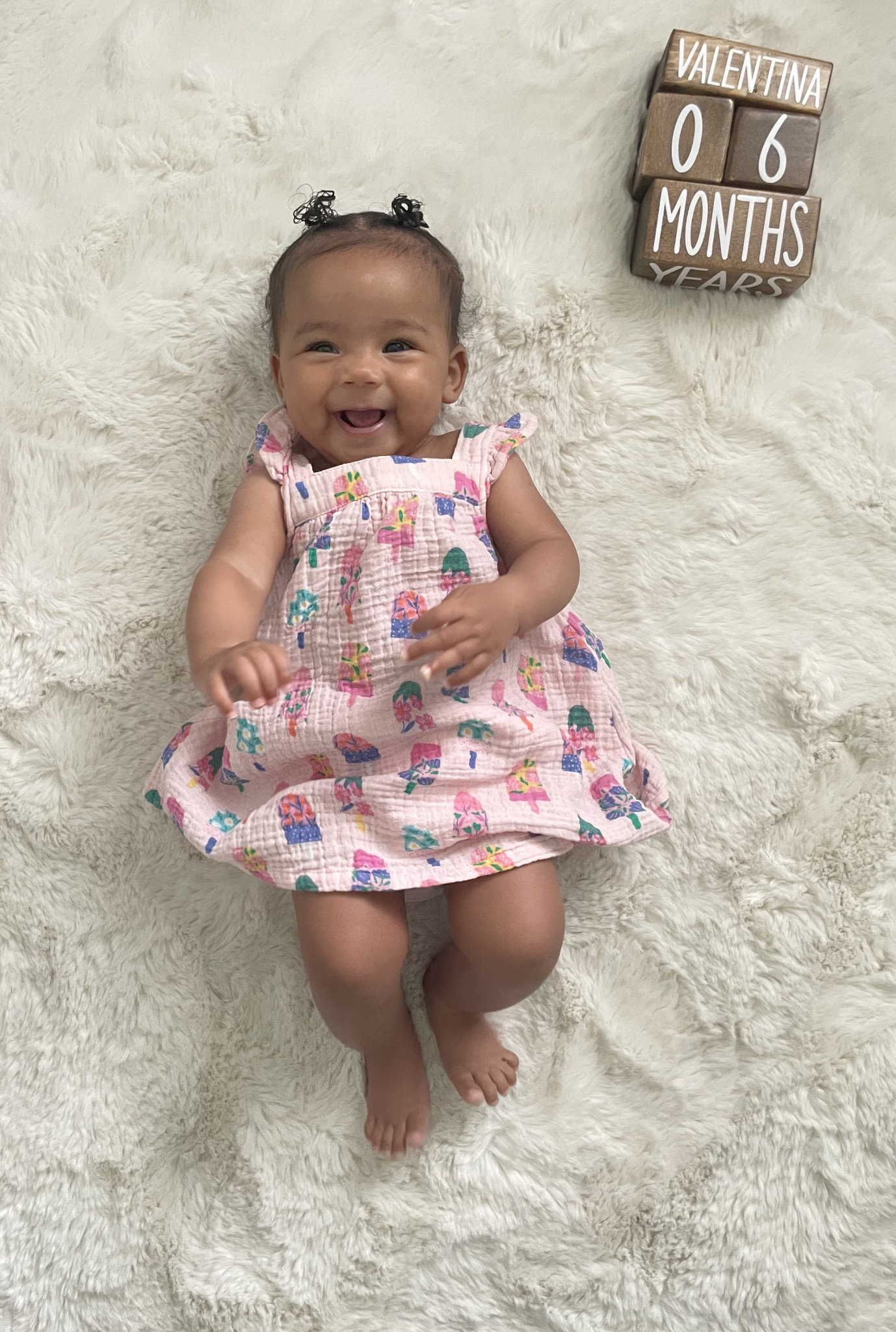 What are Valentina's favorite activities?Valentina loves to be involved and included in everything that we are doing. She loves to help us cook and clean, especially when that includes dancing around the kitchen. She enjoys playing in the grass and splashing in water, but by far, her absolute favorite activity is reading books. Babbling and touching the pictures on the pages is something she could do for hours.