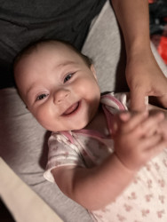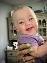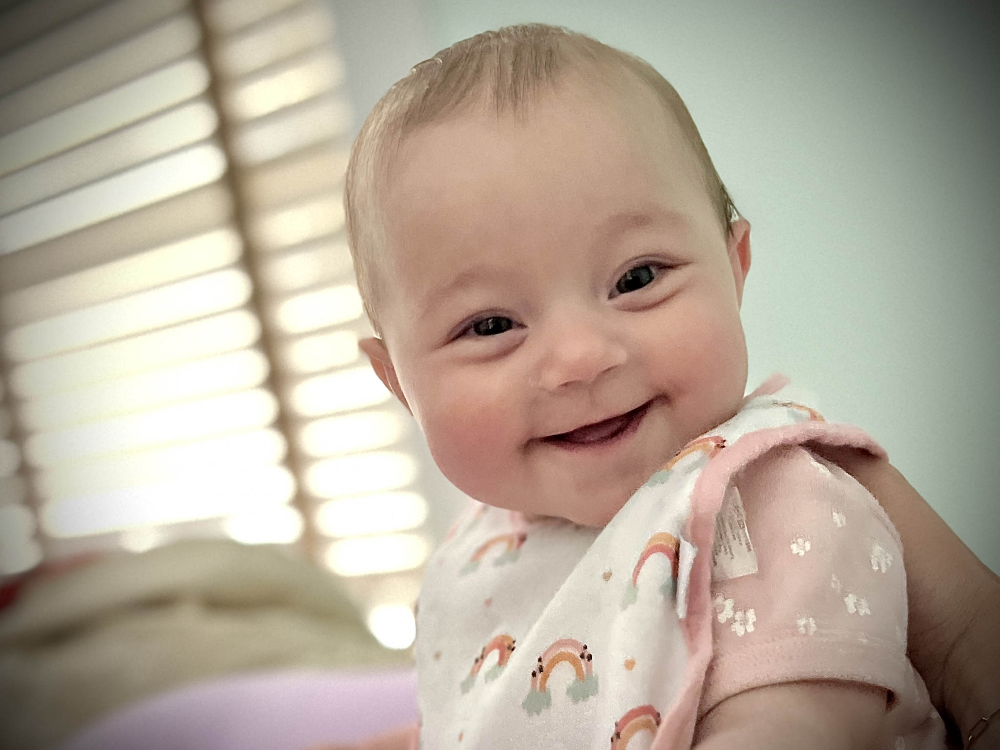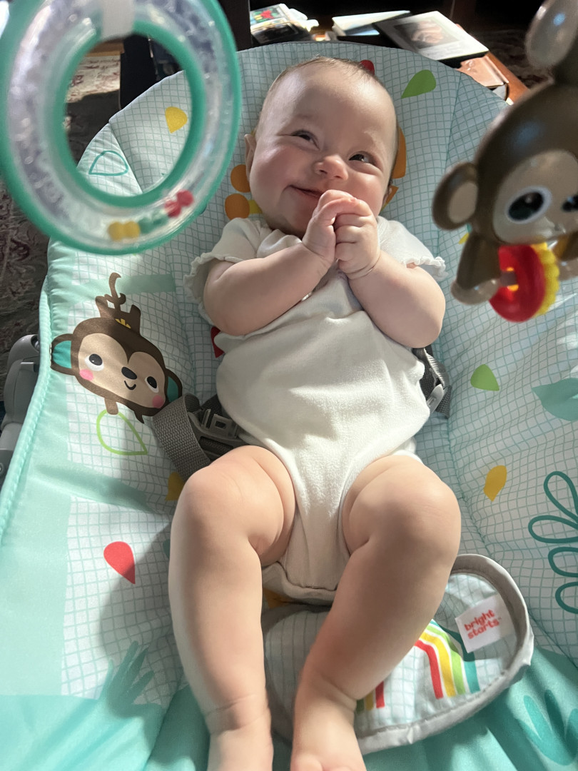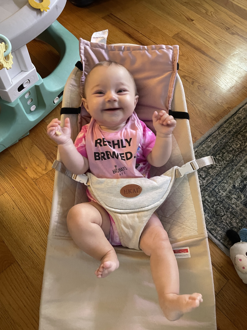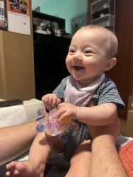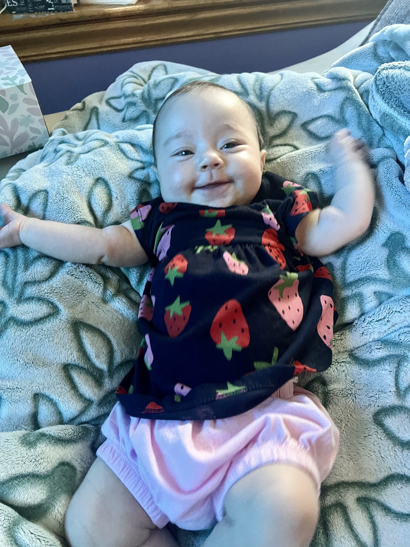 Vera is bubbly, full of smiles and giggles as she can light up a whole room. She has a special glow to her eyes that makes you forget about the tough or busy day you just had. She can be very talkative and can babble up a storm. She is very curious of her surroundings. She is also curious of herself as she realizes she can wiggle fingers, reach for things and puts her toes in her mouth. All in all, she is an angel!