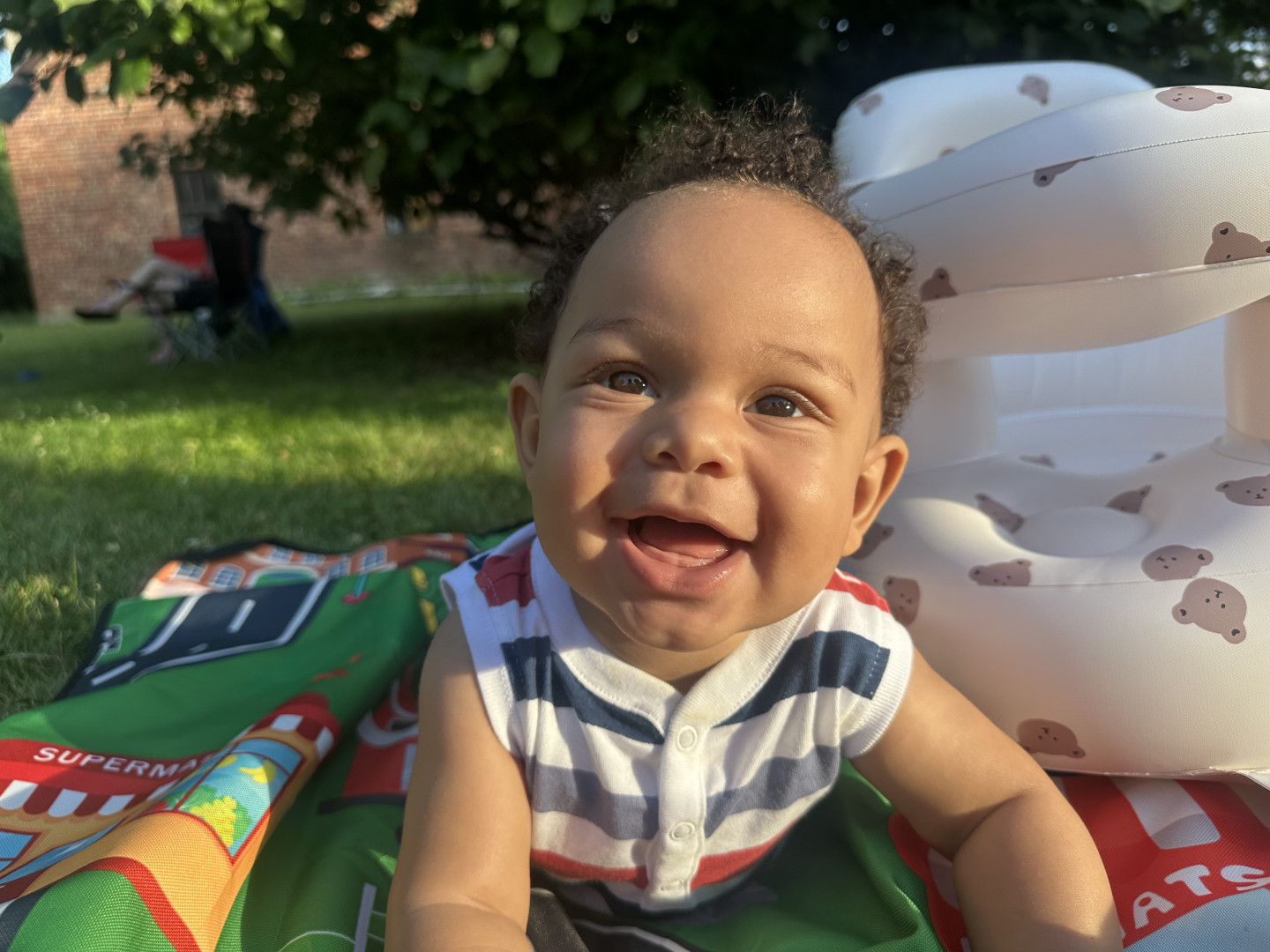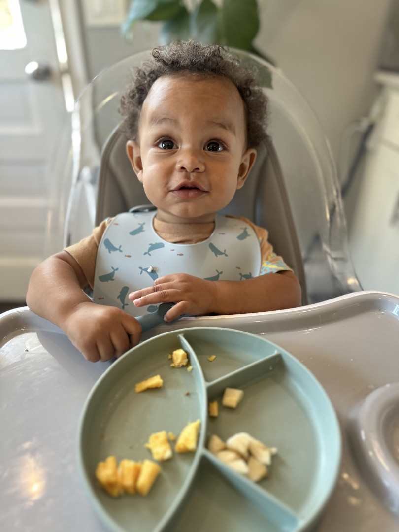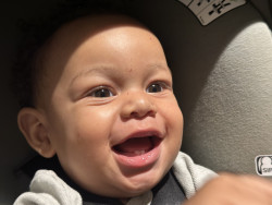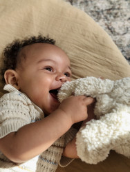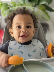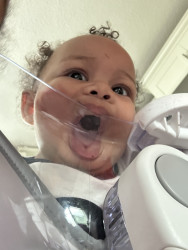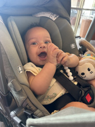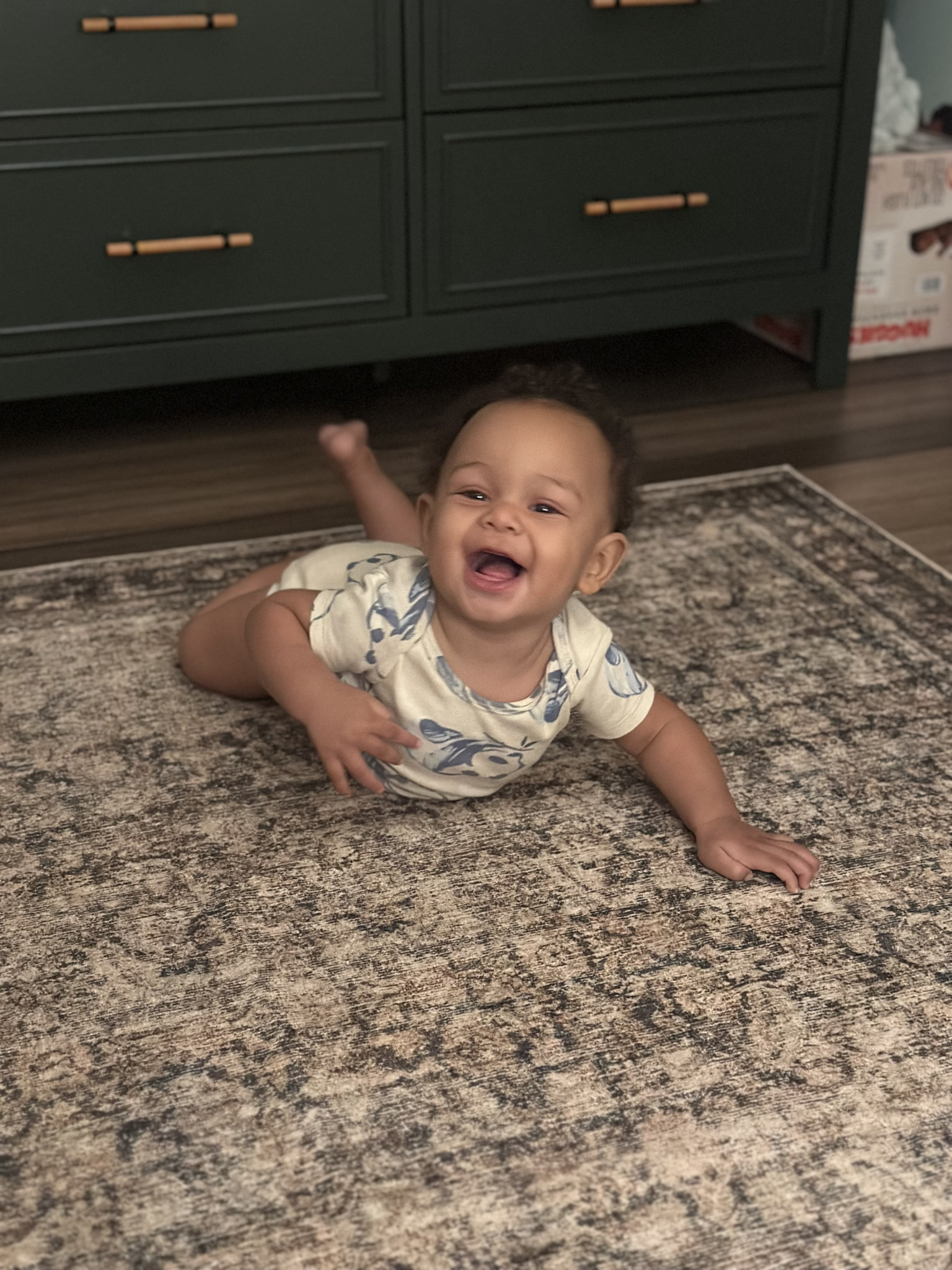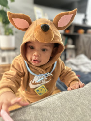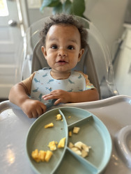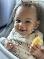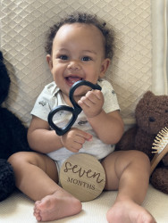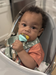 What are Zayne Robinson's favorite activities?Zayne loves to crawl BACKWARDS right now, as he’s still figuring out how to move forward. He also likes to jump around in his bouncer. His favorite activity for sure is nibbling on his teething toys and frozen fruit now that his first two teeth have finally popped out!